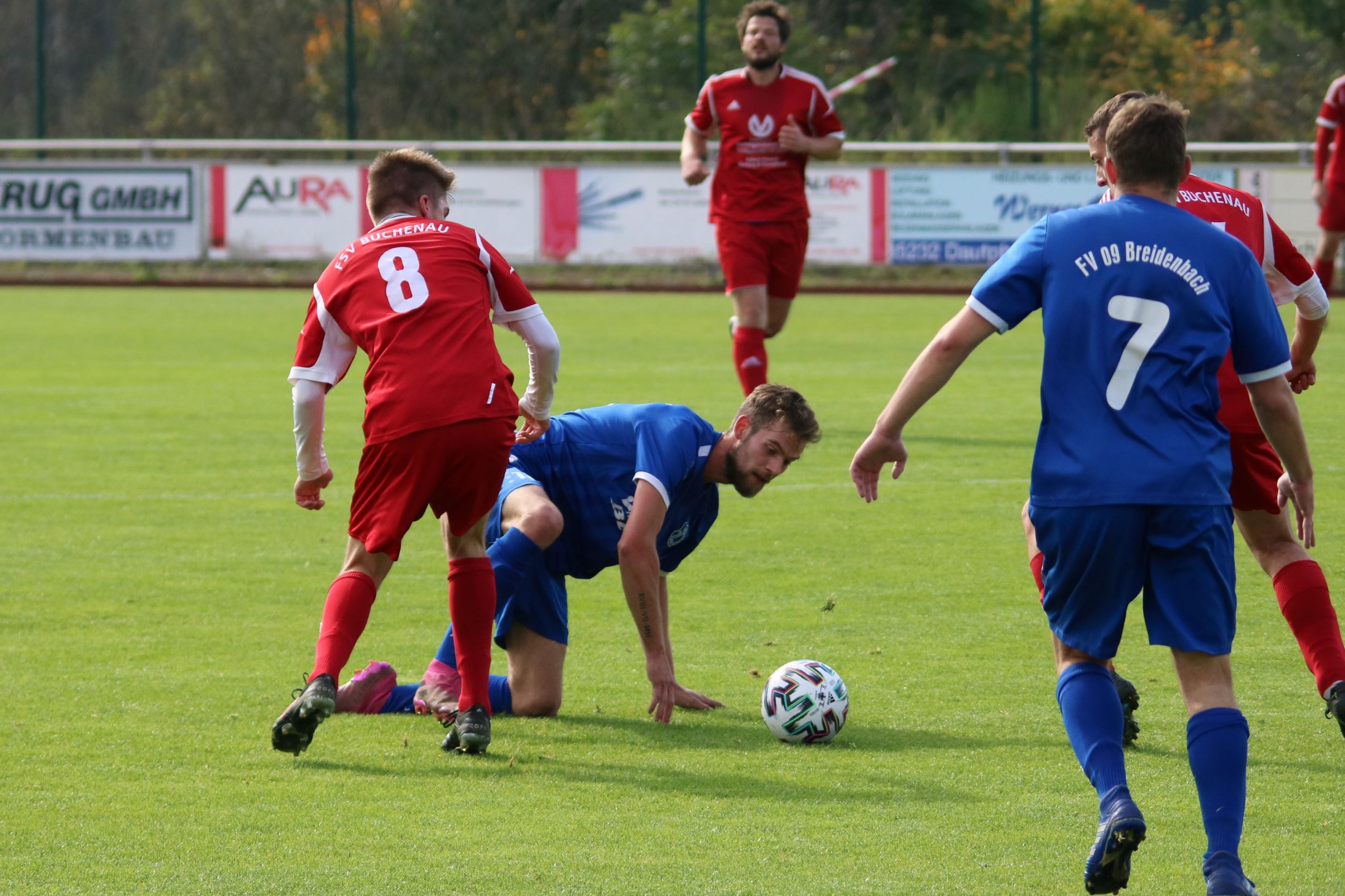 Beide Teams hatten sich viel vorgenommen und die Gäste hätten mit einem Dreier den Abstand zu unserem FV auf 4 Punkte ausweiten können. Dagegen sprach zunächst mal, dass der FSV mit einer stark ersatzgeschwächten Elf anreisen musste. Auf Breidenbacher Seite sah die personelle Situation wieder etwas besser aus und demzufolge war die Marschroute im Gunterstal klar. Spiel dominieren und einen sicheren Sieg einfahren. Das dies dann gute 60 Minuten auf dem Feld nicht so eindeutig aussah, lag zu großen Teilen an einer sehr überschaubaren Leistung unserer Elf. Es entwickelte sich von Beginn an ein doch sehr mittelmäßiges A-Ligaspiel, bei dem Buchenau in Halbzeit 1 den entscheidenden einen Fehler mehr machte, um in Rückstand zu geraten. Als Luca Arnold in der 18. Minute in der eigenen Spielhälfte als letzter Mann leichtfertig den Ball im Dribbling gegen Moritz Schmalz verlor, war es der Breidenbacher Kapitän, der sich diese Möglichkeit dann im Sprint in den Strafraum und dem eiskalten Abschluss zum 1:0 nicht mehr nehmen ließ. In der Folgezeit versuchte Buchenau im Offensivspiel Chancen herauszuspielen, scheiterte aber immer wieder an der vielbeinigen Breidenbacher Hintermannschaft. So ging es mit einem insgesamt leistungsgerechten 1:0 in die Halbzeitpause. Im 2. Durchgang legte Buchenau nochmal eine Schippe drauf und Breidenbach beschränkte sich auf sein Konterspiel gegen eine etwas offenere FSV-Mannschaft. Dabei hätte Moritz Schmalz mit seinen Sturmkollegen bei 2 bis 3 sehr guten Abschlussmöglichkeiten die Vorentscheidung herbeiführen können, schafften aber nicht den finalen Torabschluss ins Netz. Auf der Gegenseite zeigte FV-Neuzugang Silas Klab im FV-Tor heute in seinem ersten Pflichtspieleinsatz eine starke Leistung und entschärfte die wenigen FSV-Chancen sicher und souverän. Die Vorentscheidung sollte der FV 09 dann in der 67. Minute erzielen. Wiederum war es der FV-Kapitän Moritz Schmalz, der im Konterspiel mit einem sauberen Abschluss aus 14 Metern FSV-Torwart Patrick Weintraut keine Chance ließ und zum 2:0 einnetzte. Buchenau konnte in der Folge nichts mehr zulegen und folgerichtig brachten die Gastgeber im Gefühl des sicheren Sieges das Spiel über die Bühne. Dabei konnte Emre Dalda (79.) mit einem feinen Schuß unter die Querlatte und Sebastian Hengst mit einem Kontertor in der 90. Minute das Ergebnis noch deutlich ausbauen.