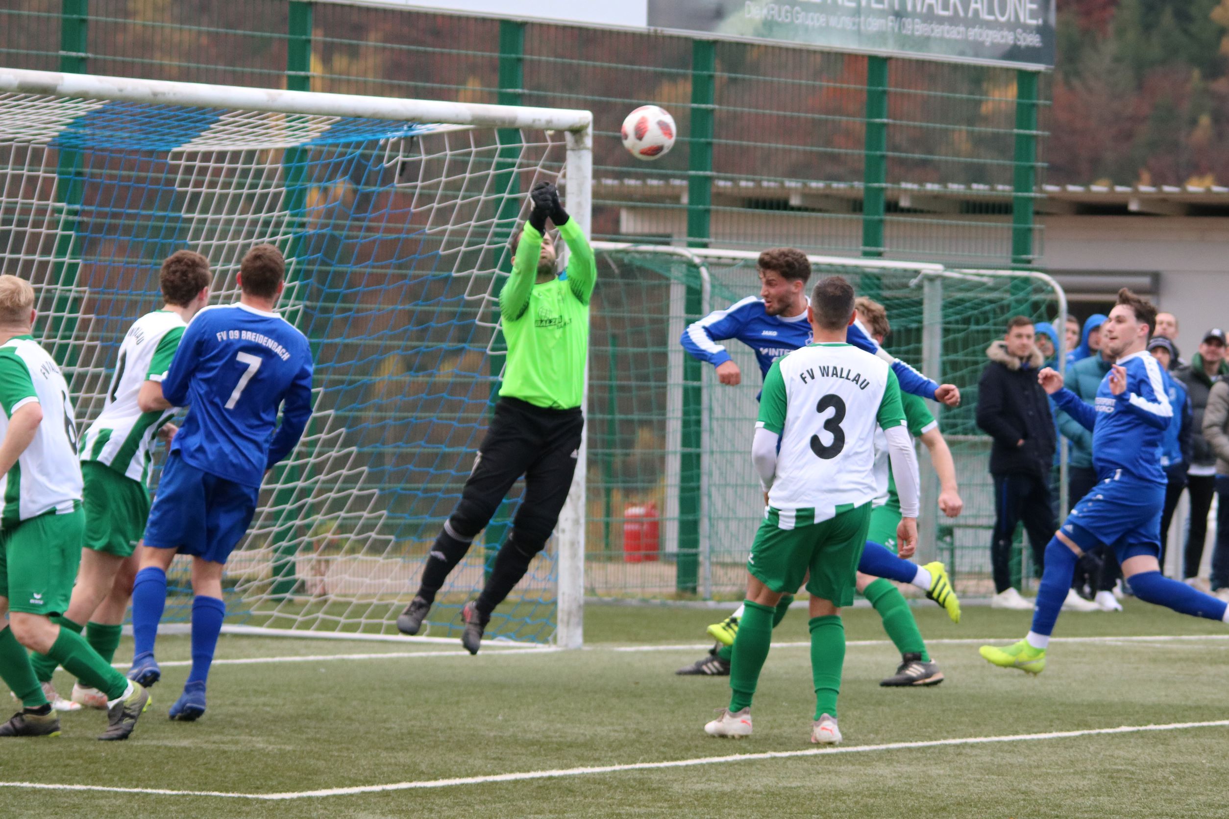 Mit einer kämpferischen Klasseleistung schaffte es Breidenbachs Reserveteam, im Derby gegen den FV Wallau mit einem 3:2-Sieg eine Partie zu ihren Gunsten zu drehen, die nach 45 Minuten schon wieder in die Hose zu gehen schien. Zuvor hatten die FV 09 - Akteure bereits beste Torchancen liegen lassen und sich so ein Stück weit selber in Bedrängnis gebracht. Immer wieder schafften es die Gastgeber, die anfällige Gästedefensive schlecht aussehen zu lassen. Die größte Chance im Spiel ließ dabei Marcel Eckhardt liegen, der Mitte der 1. Halbzeit das Leder am leeren Tor vorbei schob. Trotzdem steckte die Reitz-/Pfeiffer-Elf zu keiner Zeit auf und spielte immer wieder mit technisch guten Ansätzen nach vorne. Marco Sabau und Lukas Petri konnten dabei überzeugen und hatten allen voran mit Kapitän Moritz Schmalz und Marcel Eckhardt zwei Abnehmer im Sturm, die heute von Wallaus Defensive praktisch zu keiner Zeit auszuschalten waren. Umso überraschender konnte Wallau dann in der 40. Minute mit dem ersten wirklich klasse rausgespielten Konterangriff Jan-Niklas Pfeiffer im Zentrum in Abschlussposition bringen. Der ließ sich die Chance nicht nehmen und verwandelte zur 0:1-Gästeführung.