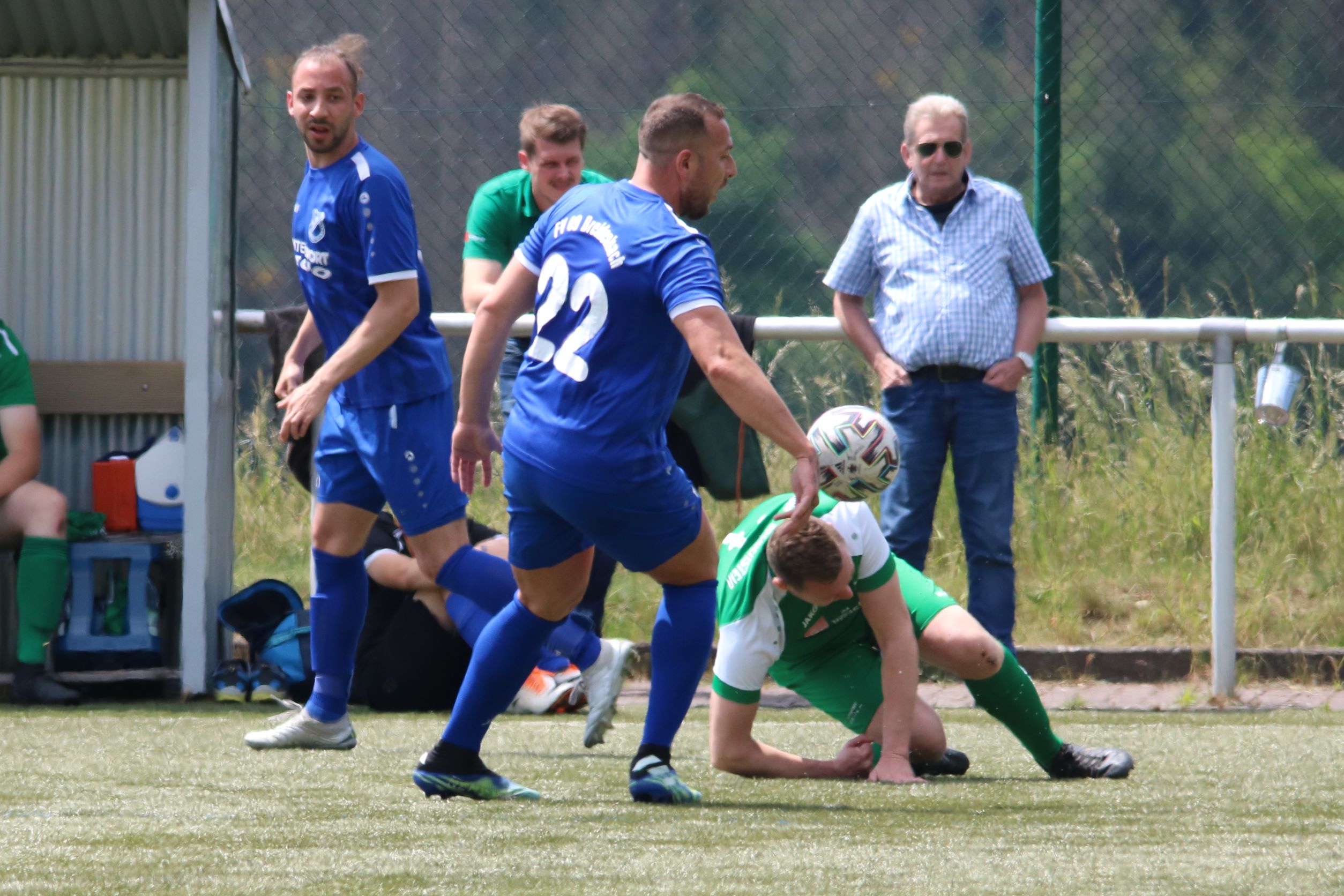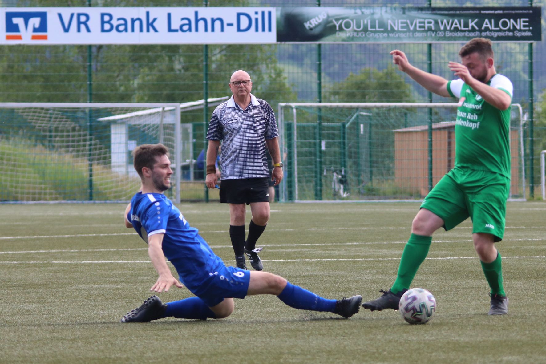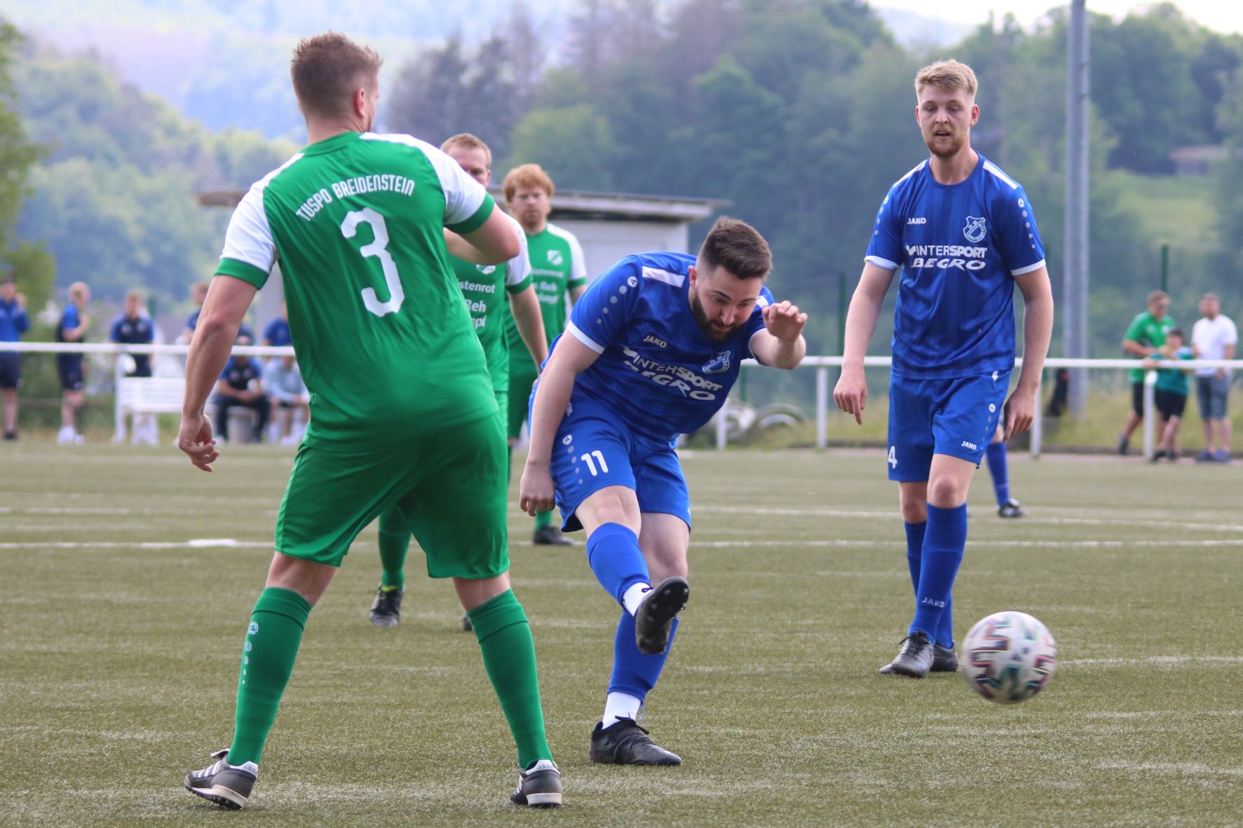 (FS/22.05.2022) Die FV-Reserve konnte am frühen Sonntagnachmittag im Heimspiel gegen den Ortsnachbarn TuSpo Breidenstein mit einem 4:2-Sieg eine geglückte Revanche für die knappe 1:2 Hinspielniederlage nehmen. Matchwinner der Begegnung war zweifelsfrei Breidenbachs Offensivakteur Ibrahim Kale, der zunächst noch FV-Geschäftsführer Luis Müller in der 27. Minute den Vortritt lassen musste. Müller erlebte sein Highlight im Spiel, als er aus guten 20 Metern das Spielgerät mit einem fulminanten Schuss in den Torwinkel des Gästegehäuses die FV-Führung herstellte. Dann sollte Kale jedoch seinen ersten Auftritt haben, als er in der 33. Minute das Leder aus 35 Metern unter die Querlatte des Gästetores zimmerte und Gästekeeper Markus Schiller keine Abwehrchance ließ. Breidenbach spielte fortan mit mehr Selbstvertrauen wie die Gäste und kontrollierte die Begegnung.