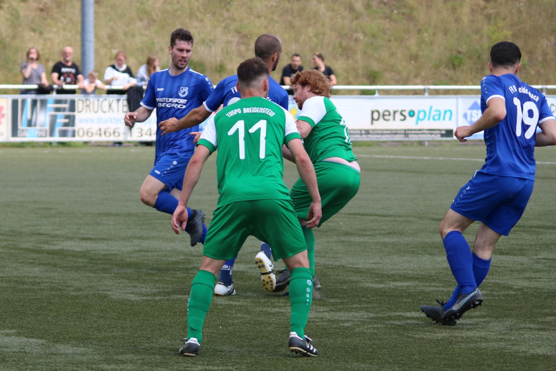 In Halbzeit sollten die Planvorgaben des Breidenbacher Trainergespanns Pfeiffer/Reitz dann nicht so richtig funktionieren. In der Folge fehlten bei allen Akteuren die berühmten Zentimeter und Prozente an Leistungsbereitschaft und Breidenstein kam mit einer guten Einstellung wieder ins Spiel zurück. Dabei profitierte Breidensteins Torjäger Daniel Gruber in der 66. Minute vom Missverständnis in Breidenbachs Abwehrbereich, die er eiskalt per Kopf zum 1:2 Anschlusstreffer nutzte. Mit der Euphorie des Anschlusstores legte der TuSpo nochmal nach und schaffte in der 71. Minute durch Jashid Alamyar den vielumjubelten 2:2 Ausgleich. Wer geglaubt hatte, dass die Partie jetzt gänzlich kippt, sollte dann aber eines besseren belehrt werden. 2 maßgebliche Gründe hierfür waren die Einwechslungen des Breidenbacher Trainergespanns, die zuerst mit Moritz Schmalz ihre Geheimwaffe aufs Feld schickten und wenig später mit der Wiedereinwechslung von Ibrahim Kale den Mann des Tages zurück aufs Grün schickten. Dieser war kaum auf dem Feld, da wurde er von Schmalz mustergültig bedient. Mit seinem fulminanten Schuss aus halbrechter Angriffsposition unter die Latte des Gästetores war der Weg zum FV-Sieg geebnet. Und nur 2 Minuten später sollte er dann mit seinem Tagestreffer Nr. 3 das Spiel endgültig entscheiden. Dann war Schluss und der FV hatte verdiente 3 Punkte eingefahren. Breidenstein konnte lange Zeit auf Augenhöhe Paroli bieten, war aber am Ende gegen Breidenbachs Matchwinner Ibrahim Kale machtlos.