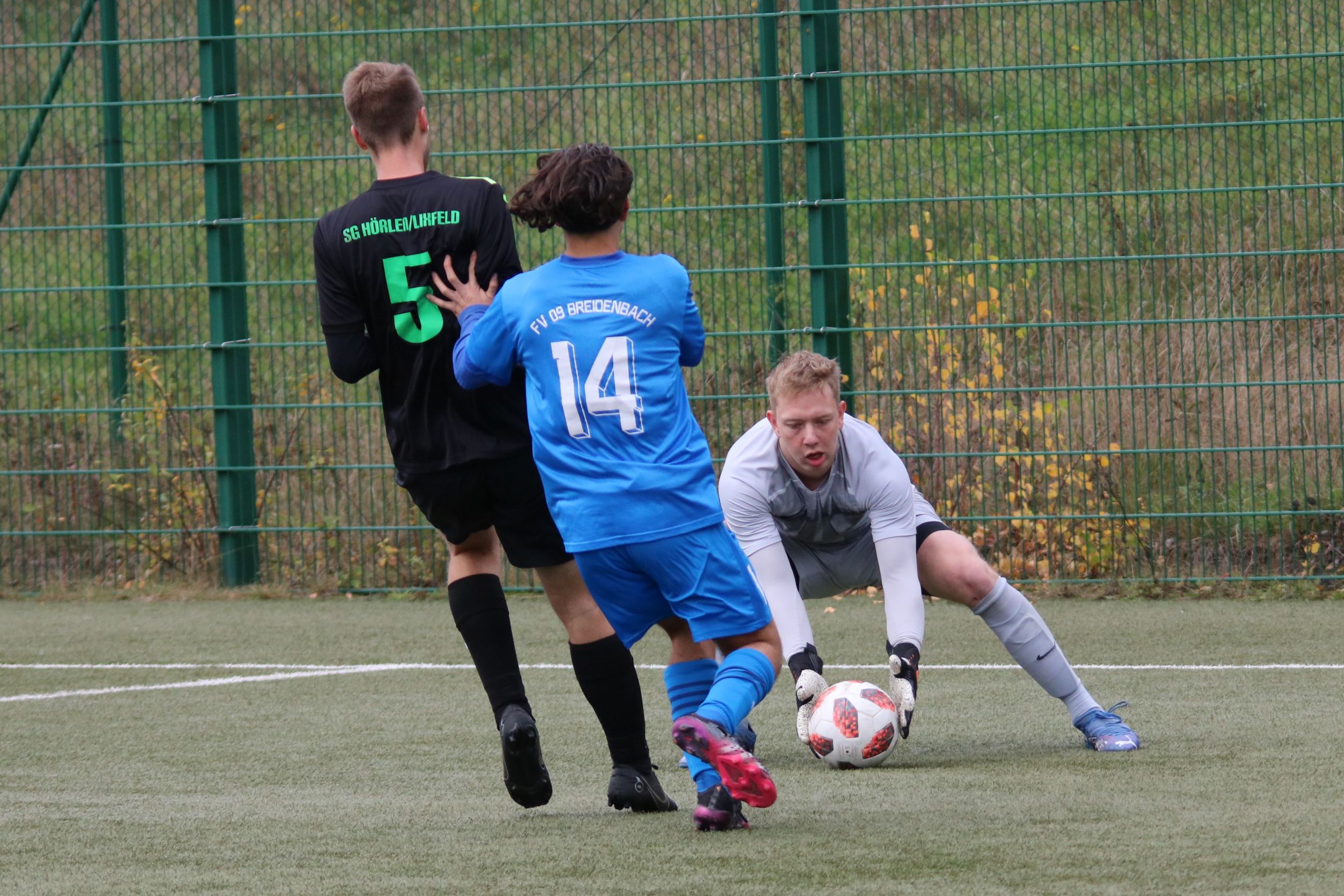 (FS/23.10.2022) Breidenbachs Reserveteam konnte den Schwung des Auswärtssieges vom vergangenen Mittwoch in Endbach nicht mitnehmen und verlor sein Heimspiel gegen die SG Hörlen/Lixfeld am Ende mit 1:4. Sicherlich 1 bis 2 Tore zu hoch, aber letztendlich doch nicht ganz unverdient, weil im Ergebnissport Fußball nun mal die Tore zählen und da waren die Gäste wesentlich effektiver wie die Gastgeber. Auch, wenn Breidenbach von Beginn an versuchte Druck aufzubauen, schafften es die Gäste in Halbzeit 1 immer wieder, geschickt zu kombinieren und gefährlich im FV-Strafraum aufzutauchen. Es dauerte bis zur 35. Minute, bis der erste Torjubel zu hören war. Gästeakteur Silas Weigel hatte per Fernschuss abgezogen. Sein Ball wurde noch unhaltbar abgefälscht und damit war die Gästeführung zum 0:1 perfekt. Und als Gästespielertrainer Christian Pfeiffer in der 42. Minute einen fragwürdigen Freistoß aus 20 Metern in den Torwinkel setzte, schien der Erfolg der Gäste vorprogrammiert.