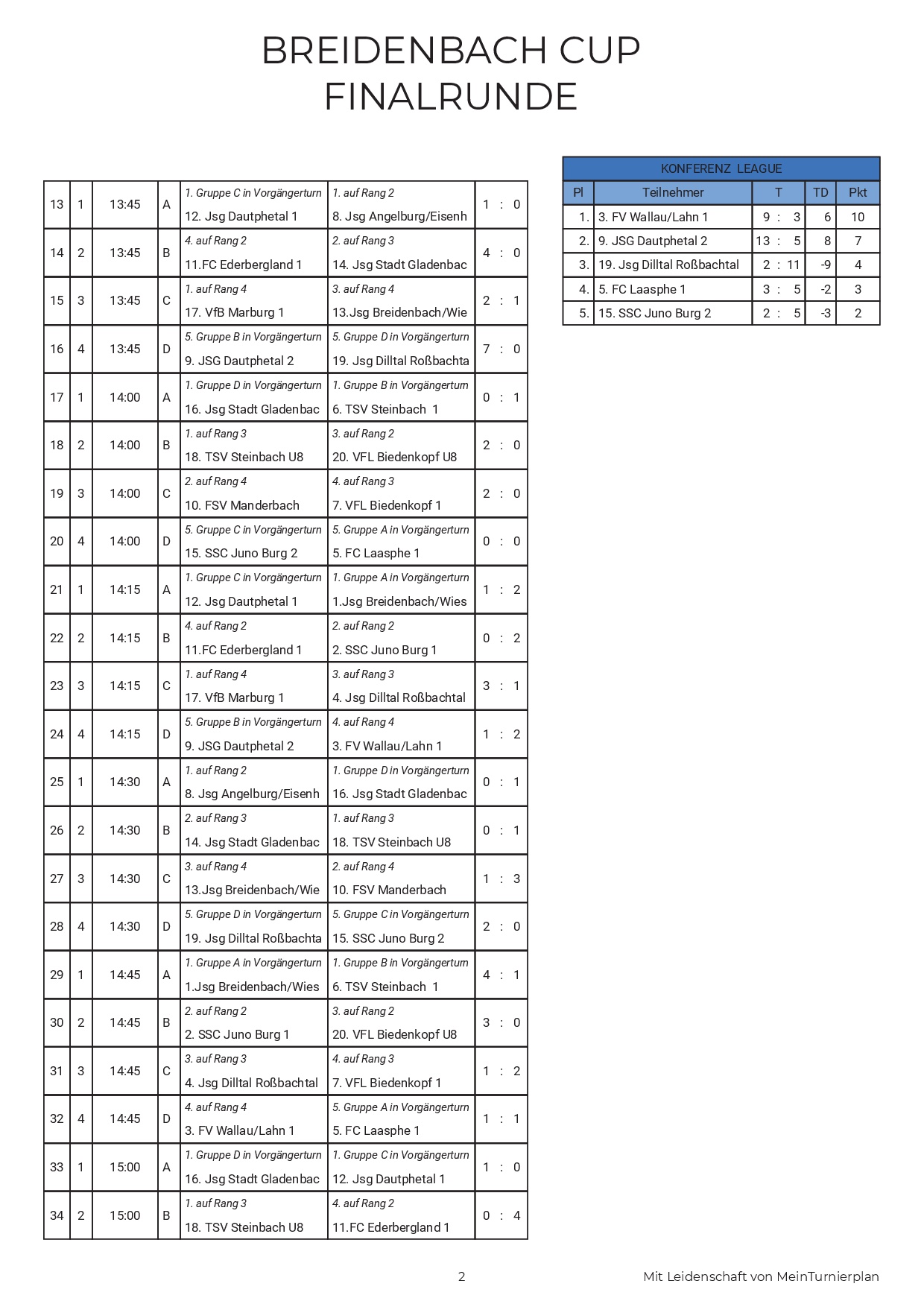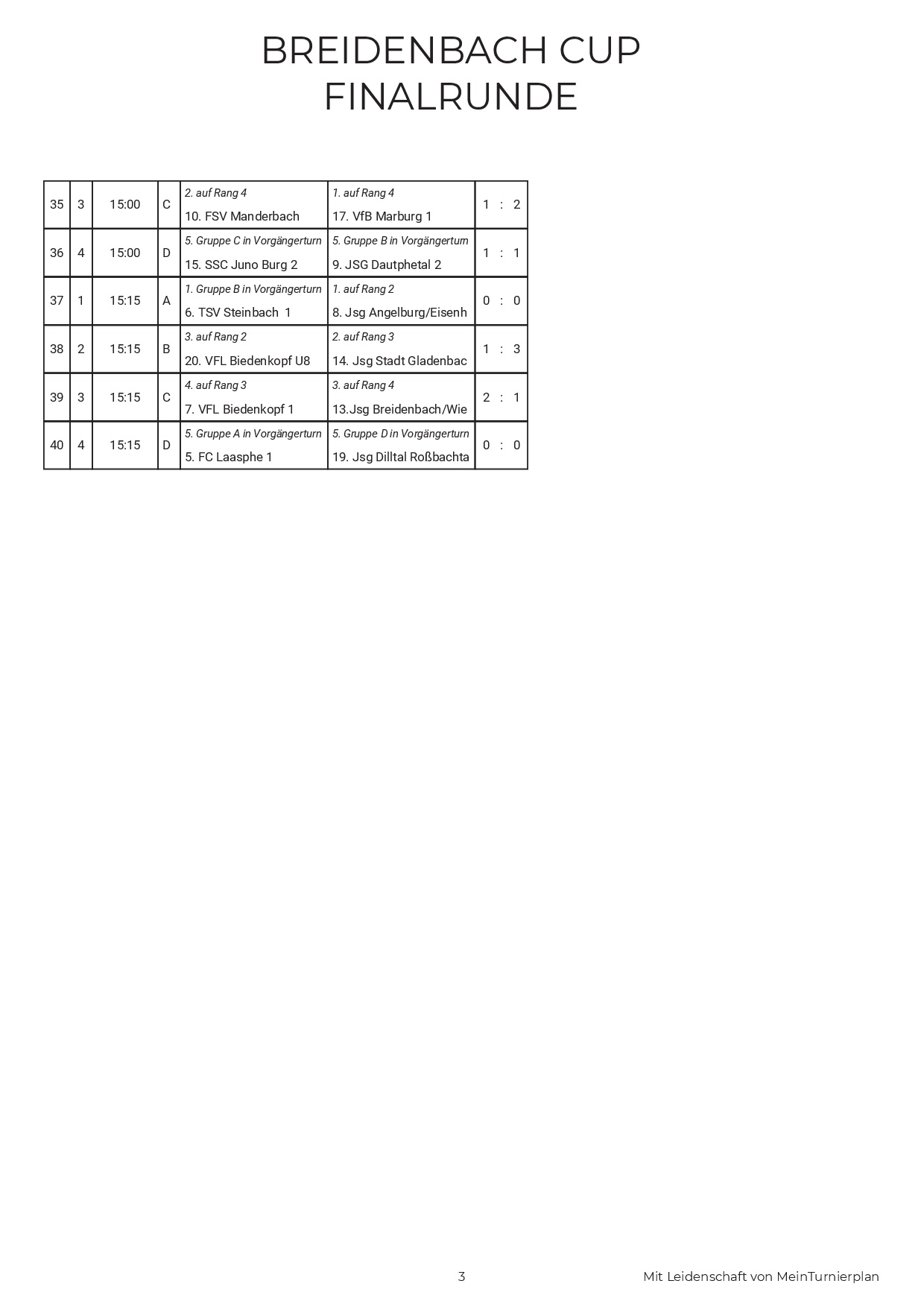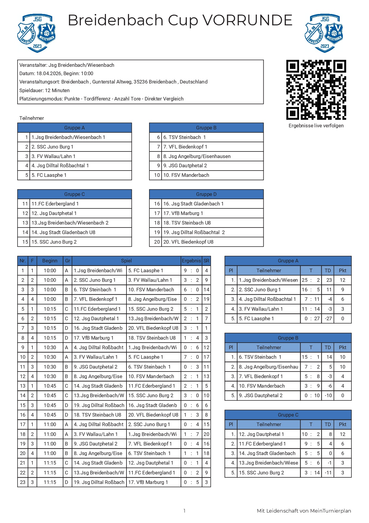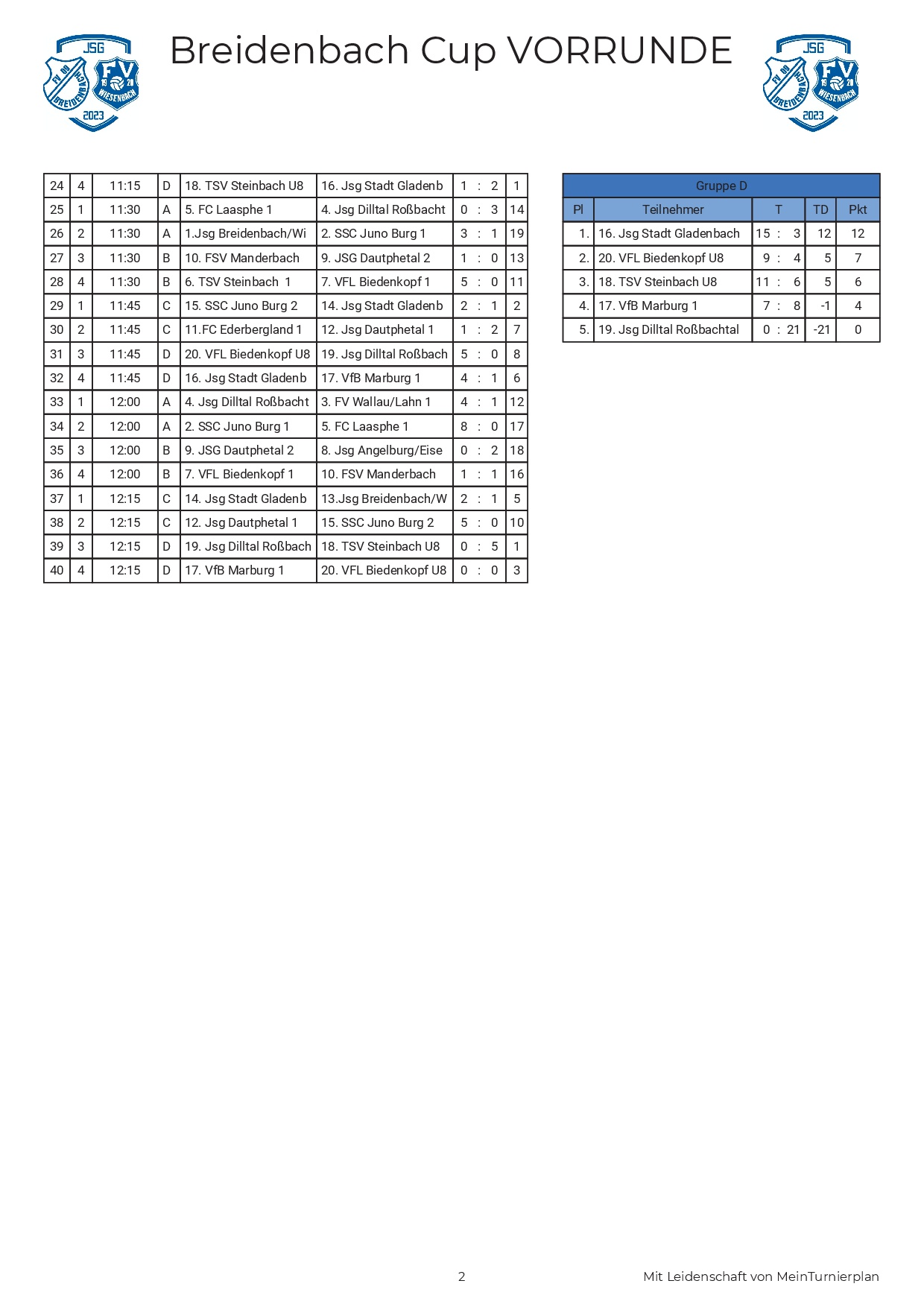 Mit 20 Teams hatten die Organisatoren der JSG Breidenbach/Wiesenbach ein vollgepacktes Teilnehmerfeld zusammengestellt und dabei ganze Arbeit geleistet. Viele fleißige Helfer präsentierten passend mit viel Sonnenschein am Samstagmorgen zu perfekten Rahmenbedingungen im Gunterstalstadion in Breidenbach allen Teilnehmern eine tolle Plattform, um sich sportlich zu messen. Mit einem sehr guten Zuschauerzuspruch war auch der äußere Rahmen gut abgedeckt, sodass sich alle auf die sportlichen Vergleiche konzentrieren konnten. Dabei sollte sich schnell herausstellen, dass die Gastgeber von der JSG Breidenbach/Wiesenbach 1 mit Trainer Martin Lokoc ihrer Favoritenrolle gerecht werden sollten. Sie dominierten von Beginn an die Spiele in der Vorrundengruppe A ebenso wie die Partien in der Finalrunde, die nach der Mittagspause gespielt wurde. Alle Teams konnten mit engagierten Auftritten dazu beitragen, dass am Ende des Tages von ein rundum gelungenen Jugendturnier gesprochen werden konnte. Den 2. Platz erspielte sich der TSV Steinbach 1 vor der JSG Dautphetal 1, die auf dem Abschlussplatz 3 landete.