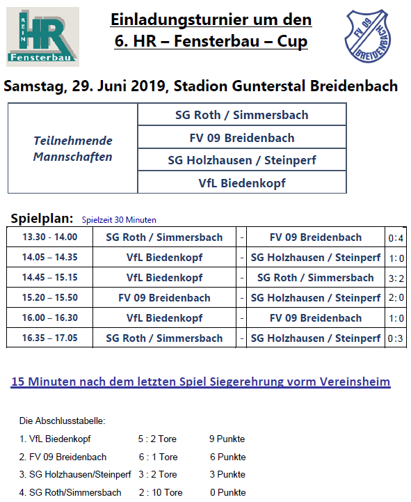 (FS) Es waren schon auch heftige Temperaturen, mit denen die 4 Mannschaften im Breidenbacher Gunterstal am Samstagnachmittag zu kämpfen hatten. Bei hochsommerlichen 30° siegte am Ende der VfL Biedenkopf nach 90 gespielten Minuten in den Duellen jeder gegen jeden. Der Gruppenligist setzte sich dabei gegen unseren FV 09 Breidenbach im entscheidenden 3. Spiel mit 1:0 durch ein Tor von Tim Napierala in der 10. Minute durch. Die Breuer-Elf unseres FV 09 konnte seine guten Torchancen nicht nutzen und musste sich nach 2 weiteren Siegen gegen die SG Roth/Simmersbach mit 4:0 (Torschützen Cord Beumer (FE), Tim Strack (2) und Yannick Weber) und dem 2:0-Sieg gegen die SG Holzhausen/Steinperf mit dem 2-fachen Torschütze Lucas Ortmüller am Ende des Tages mit dem 2. Platz zufrieden geben. Turnierdritter wurde die SG Holzhausen/Steinperf, die sich im Duell der A-Ligaaufsteiger gegen die SG Roth/Simmersbach mit 3:0 durchsetzen konnte. Biedenkopf hatte im Duell mit der SG Roth/Simmersbach mit einem knappen 3:2 die Oberhand behalten können. Ebenso glückte dem VfL im Duell mit der SG Holzhausen/Steinperf ein hauchdünner 1:0-Sieg, sodass am Ende ein verlustpunktfreier Turniertag mit einem verdienten Sieg dabei heraus sprang.