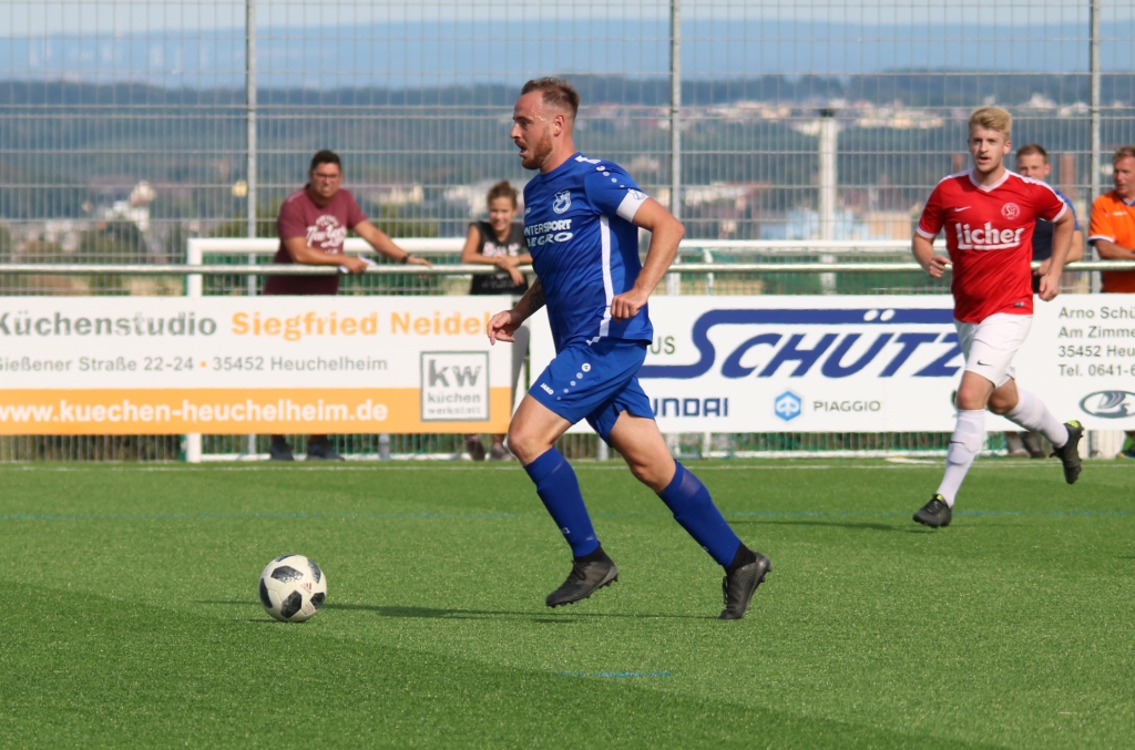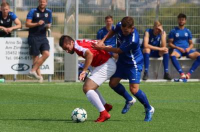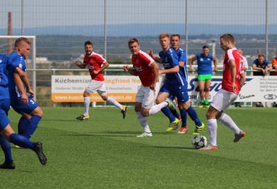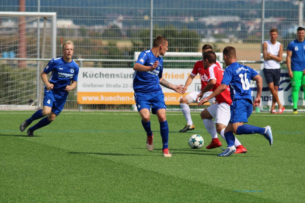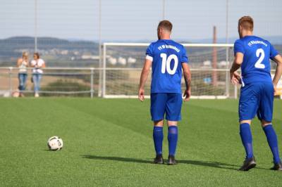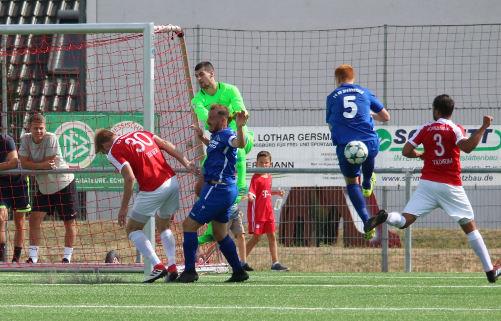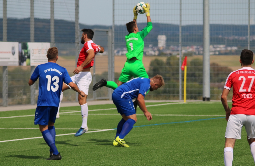 (FS) Es läuft bei den Blau-Weißen! Auch im ersten Auswärtsspiel der Saison zeigte sich das Team um Kapitän Felix Baum als gut organisiertes Verbandsligateam, dass sich körperlich fit und taktisch gut eingestellt gegen eine gute Elf der SG Kinzenbach durchsetzte. Am Ende stand es nicht unverdient 2:1 für den Hinterländer Verbandsligisten, der zunächst die Partie gut im Griff hatte und optisch sein Spiel gut und geordnet nach vorne brachte. Es dauerte so knapp 20 Minuten, bis Kinzenbach sich ins Spiel gekämpft hatte und selber mit gefährlichen Angriffen erste Ansprüche auf Tore geltend machen wollte. Das SG-Sturmduo Ahmet Marankoz und Max Mohr deutete seine Torgefährlichkeit ansatzweise an, fand jedoch immer wieder in Breidenbachs Innenverteidigern Julian Kapitza und Yannick Weber ihre Meister. Glück hatte der FV 09 in der 11. Minute, als Marankoz auf Mohr spielte, dieser um wenige Zentimeter im Abseits stand und somit sein Treffer durch den Pfiff des sehr umsichtigen Schiedsrichters keine Anerkennung fand. Kinzenbach erspielte sich mit zunehmender Spieldauer der 1. Halbzeit ein leichtes Chancenplus, wenngleich FV-Keeper Tobias Ochs nur einmal in der 29. Minute direkt eingreifen musste, als Marankoz im Strafraum abgezogen hatte. Ansonsten verfehlten die Kinzenbacher Torschüsse das FV-Gehäuse. Ausnahme hierzu dann 2 mal kurz vor der Pause, als zunächst Marankoz aus kurzer Distanz den Außenpfosten traf und praktisch mit dem Halbzeitpfiff Max Mohr per 25-Meterfreistoß über die Abwehrmauer nur das Aluminium traf. Auf der Gegenseite hatte aber auch Breidenbach seine Chancen. Baums Freistoß (15.), den SG-Keeper Yaman aus der untern Ecke fischte, oder die Abwehraktion von Kinzenbachs Yildirim (20.), die nur haarscharf über die eigene Torlatte ging, waren für die SGK brenzliche Situationen. Die beste Gelegenheit hatte der FV 09 jedoch in der 30. Minute, als sich Basti Wanke über rechts durchspielte und das Leder perfekt in den Lauf von Simon Reiprich legte. Der fegte den Ball mit Volldampf aufs und ganz knapp über das Tor der Gastgeber.