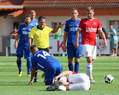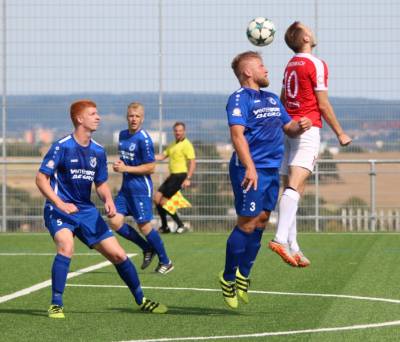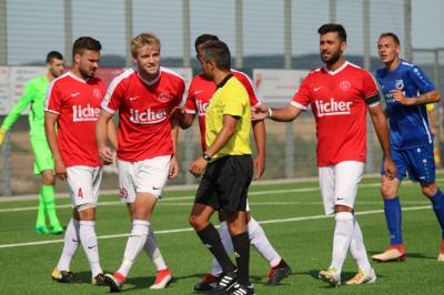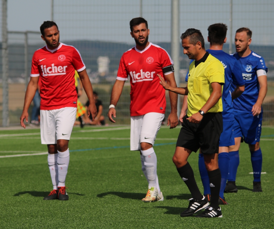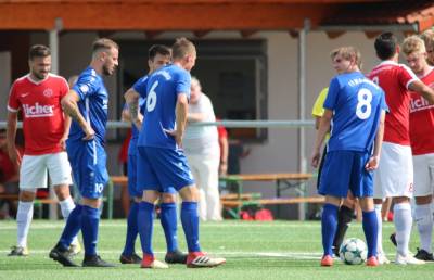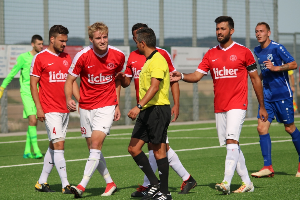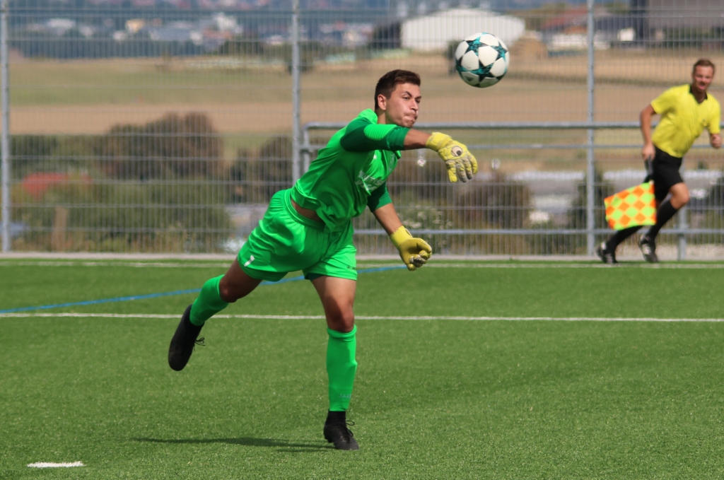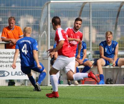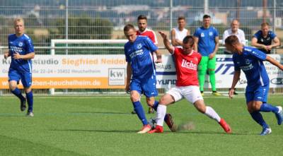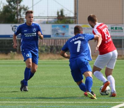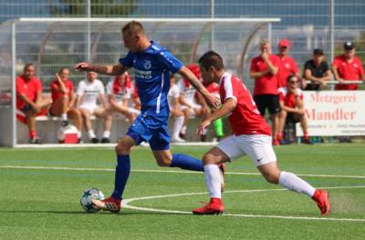 (FS) Es läuft bei den Blau-Weißen! Auch im ersten Auswärtsspiel der Saison zeigte sich das Team um Kapitän Felix Baum als gut organisiertes Verbandsligateam, dass sich körperlich fit und taktisch gut eingestellt gegen eine gute Elf der SG Kinzenbach durchsetzte. Am Ende stand es nicht unverdient 2:1 für den Hinterländer Verbandsligisten, der zunächst die Partie gut im Griff hatte und optisch sein Spiel gut und geordnet nach vorne brachte. Es dauerte so knapp 20 Minuten, bis Kinzenbach sich ins Spiel gekämpft hatte und selber mit gefährlichen Angriffen erste Ansprüche auf Tore geltend machen wollte. Das SG-Sturmduo Ahmet Marankoz und Max Mohr deutete seine Torgefährlichkeit ansatzweise an, fand jedoch immer wieder in Breidenbachs Innenverteidigern Julian Kapitza und Yannick Weber ihre Meister. Glück hatte der FV 09 in der 11. Minute, als Marankoz auf Mohr spielte, dieser um wenige Zentimeter im Abseits stand und somit sein Treffer durch den Pfiff des sehr umsichtigen Schiedsrichters keine Anerkennung fand. Kinzenbach erspielte sich mit zunehmender Spieldauer der 1. Halbzeit ein leichtes Chancenplus, wenngleich FV-Keeper Tobias Ochs nur einmal in der 29. Minute direkt eingreifen musste, als Marankoz im Strafraum abgezogen hatte. Ansonsten verfehlten die Kinzenbacher Torschüsse das FV-Gehäuse. Ausnahme hierzu dann 2 mal kurz vor der Pause, als zunächst Marankoz aus kurzer Distanz den Außenpfosten traf und praktisch mit dem Halbzeitpfiff Max Mohr per 25-Meterfreistoß über die Abwehrmauer nur das Aluminium traf. Auf der Gegenseite hatte aber auch Breidenbach seine Chancen. Baums Freistoß (15.), den SG-Keeper Yaman aus der untern Ecke fischte, oder die Abwehraktion von Kinzenbachs Yildirim (20.), die nur haarscharf über die eigene Torlatte ging, waren für die SGK brenzliche Situationen. Die beste Gelegenheit hatte der FV 09 jedoch in der 30. Minute, als sich Basti Wanke über rechts durchspielte und das Leder perfekt in den Lauf von Simon Reiprich legte. Der fegte den Ball mit Volldampf aufs und ganz knapp über das Tor der Gastgeber.