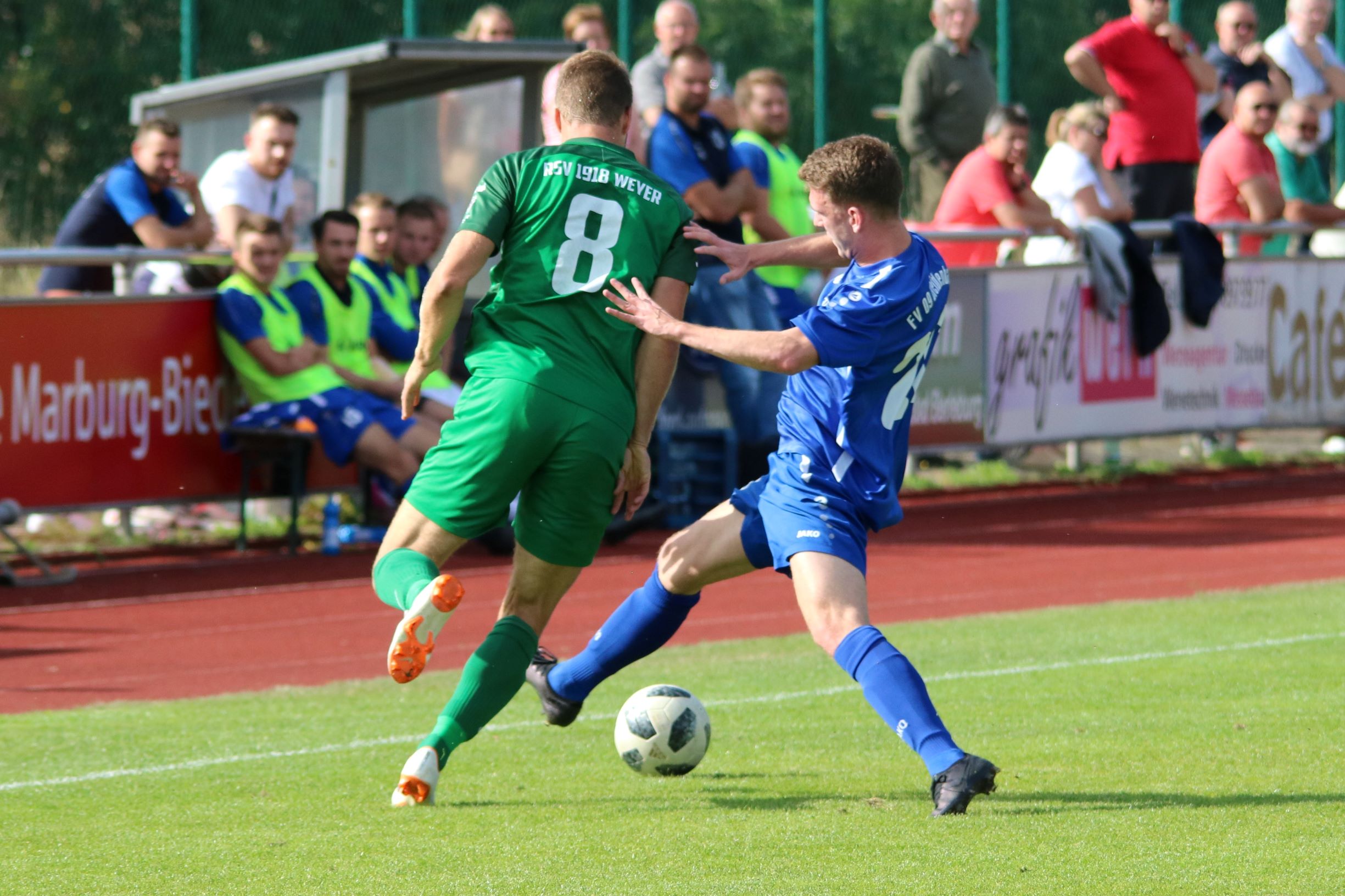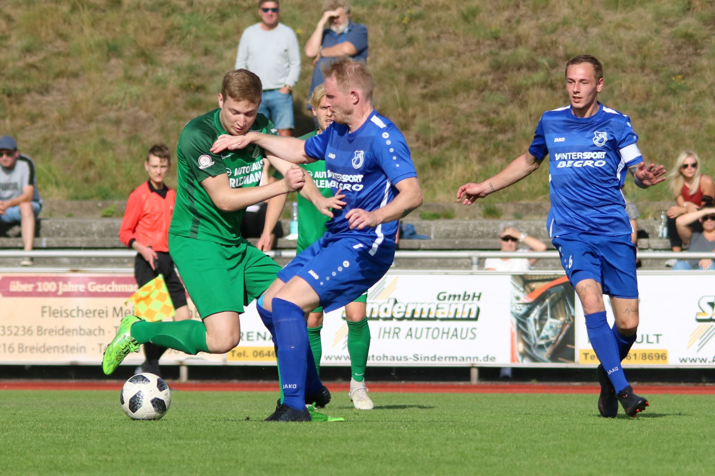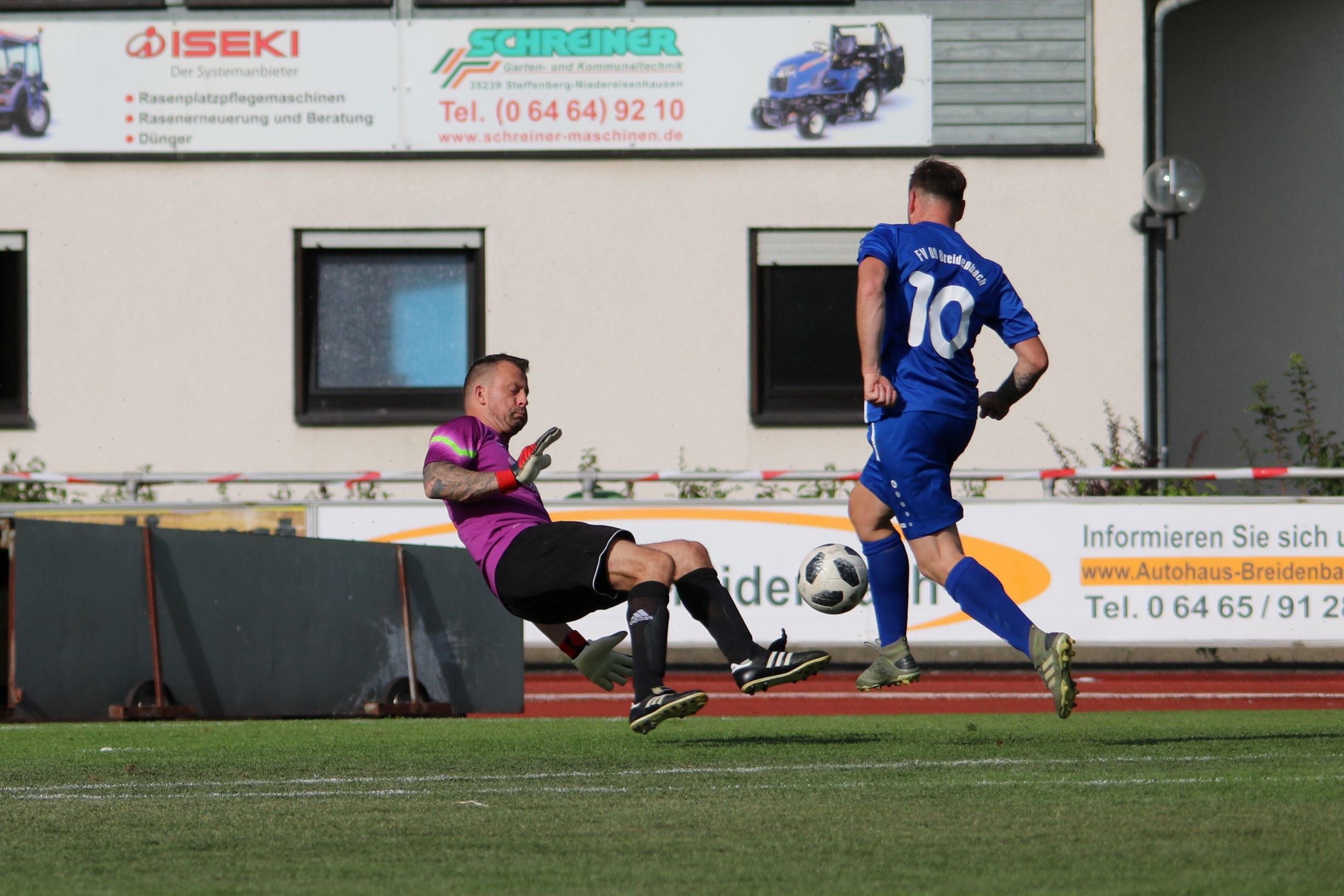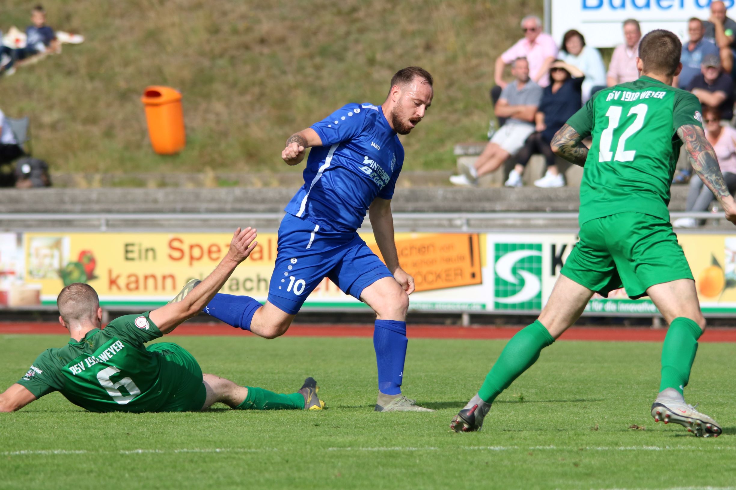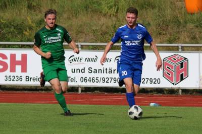 Mit einem klaren und hochverdienten 7:0-Sieg siegte unsere Elf am heutigen Nachmittag im Heimspiel gegen den RSV Weyer. Dabei begannen die Gäste durchaus auf Augenhöhe und gestalteten das Spiel in der ersten Phase der Begegnung durchaus offen. Dabei zeigte sich der Tabellenletzte mit forschem Offensivspiel mit einigen guten Ansätzen, jedoch ohne wirklich Durchschlagskraft in vorderster Front zu erzeugen. Das lag natürlich auch an der konsequenten Abwehrarbeit in der FV-Elf, die sowohl ganz hinten in der letzten Reihe wie auch schon im Mittelfeld und beginnend in der Sturmreihe mit gutem Pressing dem Gegner die Lauf- und Passwege immer wieder zustellte. Die erste nenneswerte Torgelgenheit sollte Breidenbach schon nach 60 Sekunden haben, als Aaron Künkel über die linke Angriffsseite nach vorne stürmte und in der Strafraummitte Felix Baum bediente. Der kam um einen Sekundenbruchteil zu spät und so konnte der RSV Weyer klären. Weyer zeigte sich unbeeindruckt und hatte selber in der 5. Minute ebenfalls eine erste Schußgelegenheit, als Tillmann Stillger aus halbrechter Position am langen Torpfosten vorbei zielte. Der FV 09 gewann mit zunehmender Spieldauer immer mehr Sicherheit im eigenen Spiel und entwickelte im Mittelfeld mit Johannes Burk, Kapitän Lukas Müller und Basti Wanke eine spielerische Überlegenheit, die sich in der Folge auch im Offensivbereich in Form von Torchancen zeigen sollte. Als in Minute 23 Basti Wanke den Ball erkämpfte und auf der rechten Angriffsseite mit einer klasse Leistung seinen Gegenspieler abschüttelte, war die Vorarbeit zum 1:0 praktisch vollzogen. Seine Passvorlage auf Felix Baum nutzte dieser eiskalt und vollendete zum 1:0 für sein Team. Jetzt war so richtig Zug drin auf Breidenbacher Seite und das zeigte sich dann auch in der 32. Minute, als Lucas Ortmüller kampfstark im Zweikampf seinen Gegner stehen ließ und mit einem platzierten Linksschuß das 2:0 erzielte. Beim FV 09 zeigten alle Akteure, dass die letzten Spiele ordentlich Selbstvertrauen gebracht hatten. So spielte auf der rechten Außenverteidigerbahn Nils Cakar auch heute wieder eine klasse Partie. Sein Torschuß in der 35. Minute konnte RSV-Keeper Frank Naumann parieren. Dass beim FV 09 die Defensivarbeit heute einwandfrei funktionierte, demonstrierte Yannick Weber dann in der 40. Minute, als er seinem Gegenspieler David Seibel in aller höchster Not mit einer top Grätsche den Torschrei von den Lippen nahm. Und dann hatte Weyer in der 42. Minute mit dem Kopfball von Raphael Schmidt eine weitere nennenswerte Gelegenheit, die Zählbares hätte bringen können. Da hätte - wenn und aber bekanntlich jedoch nichts zählen im Fußball blieb es bei der verdienten Halbzeitführung des FV 09.