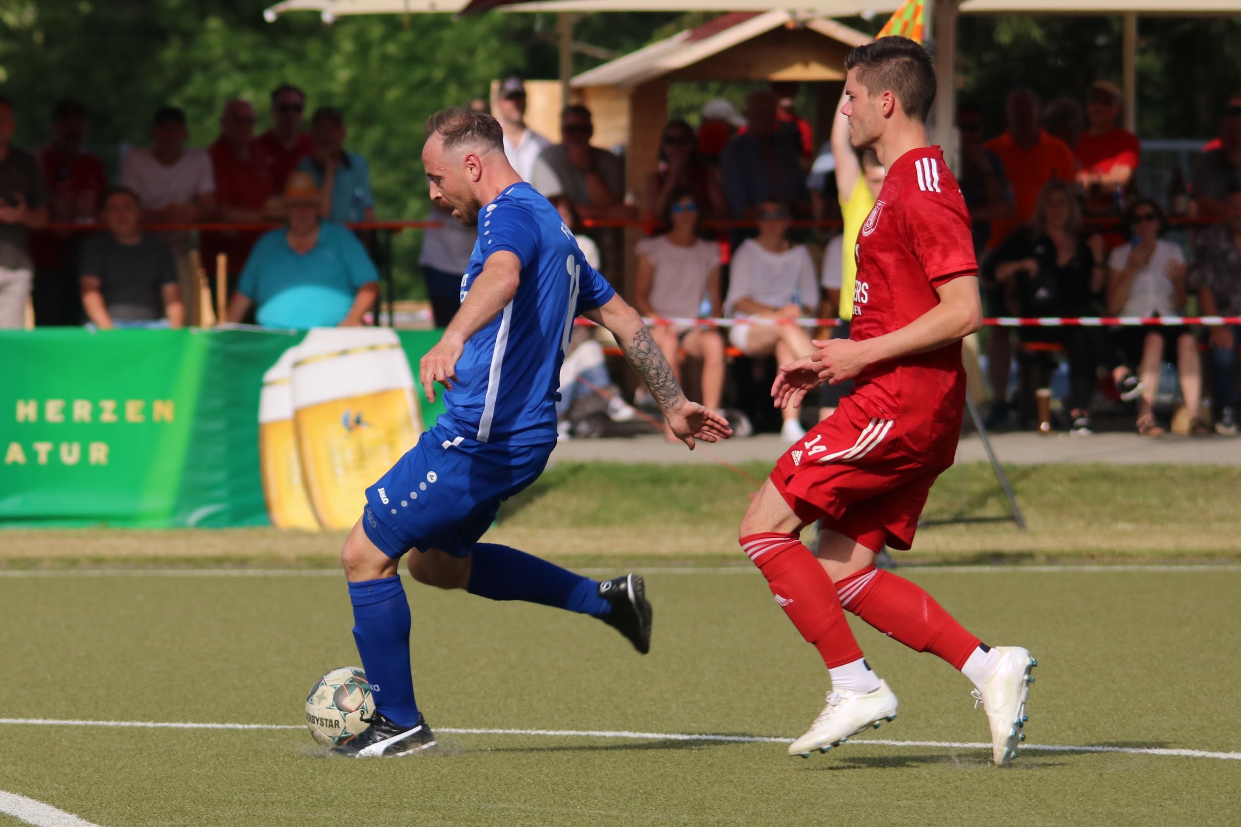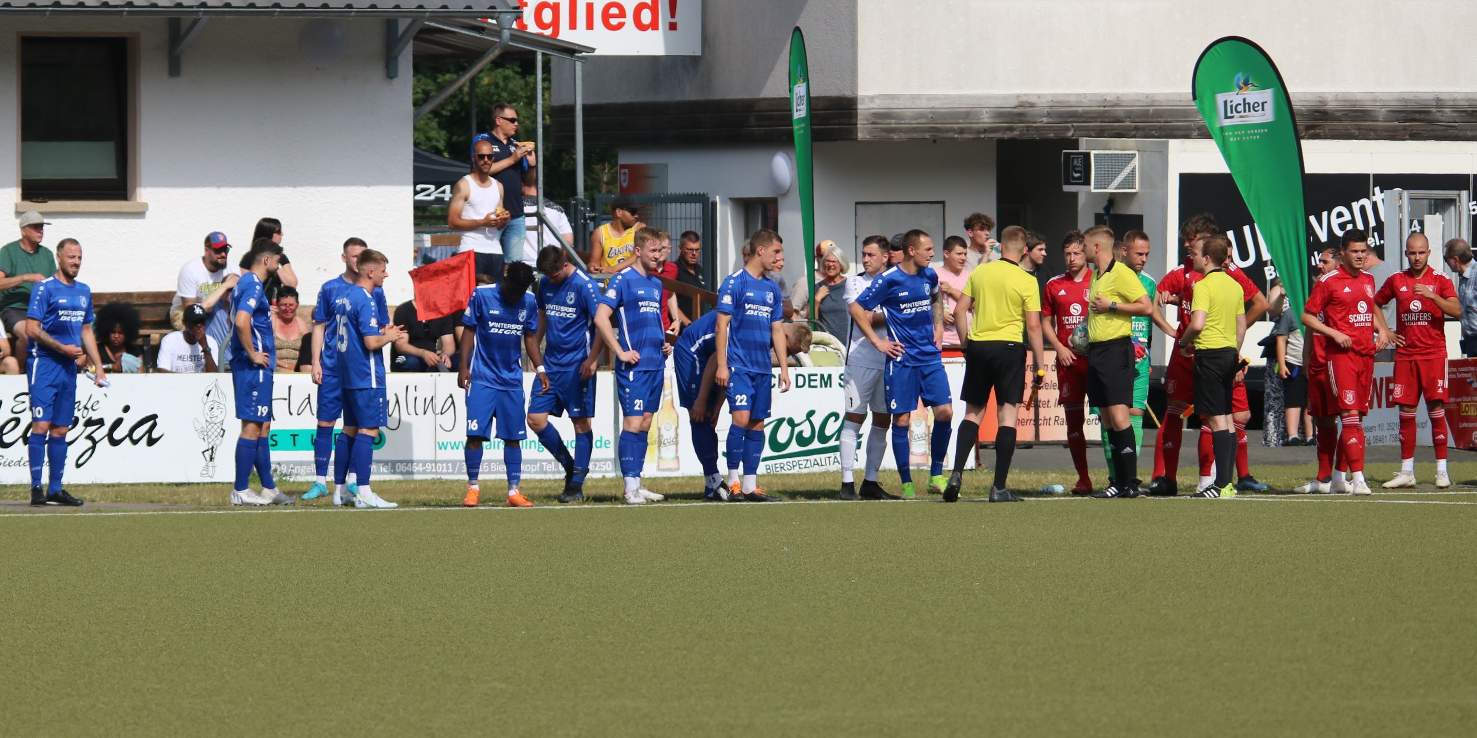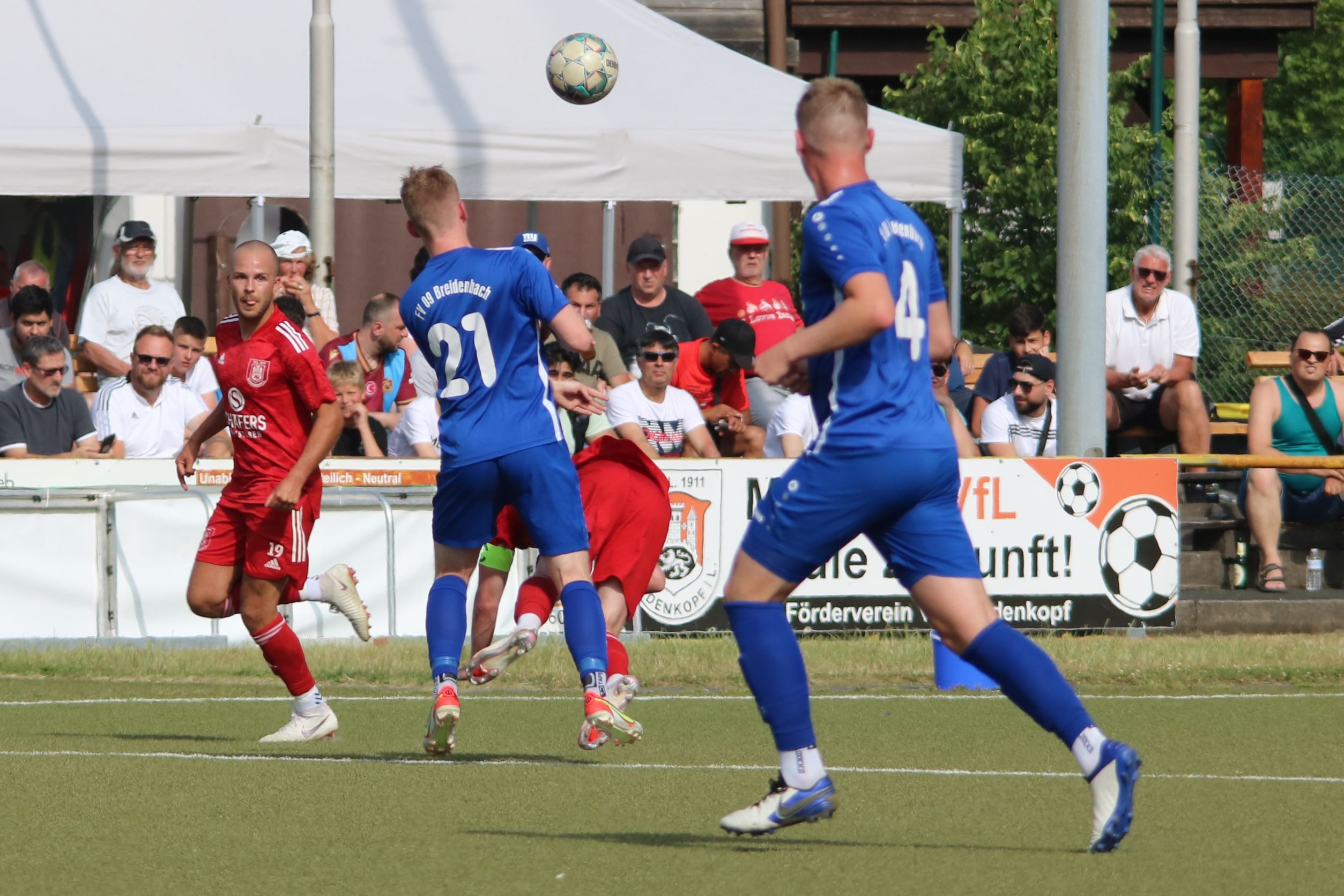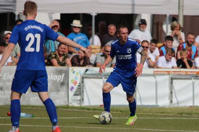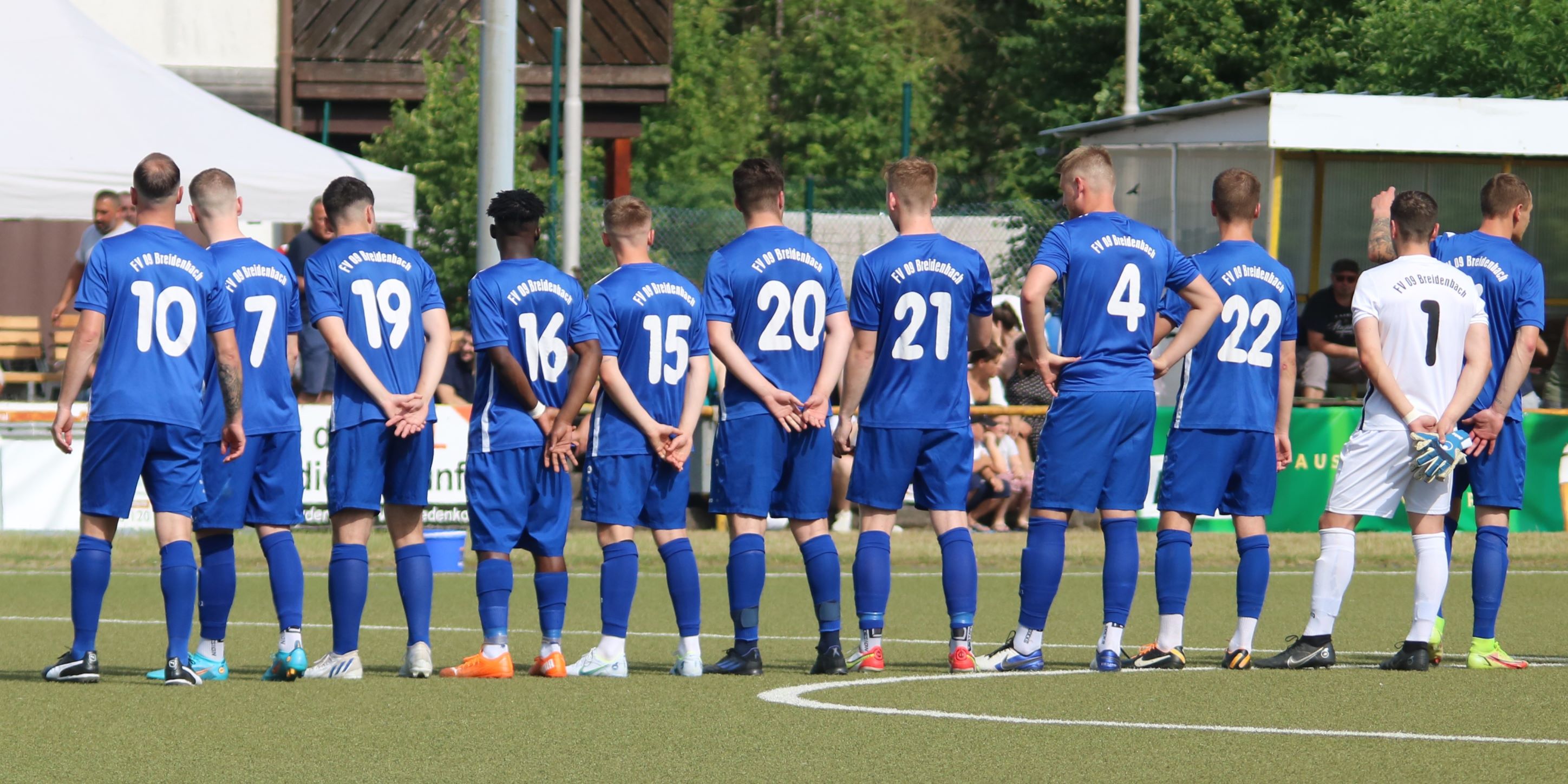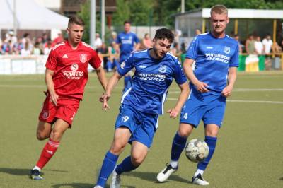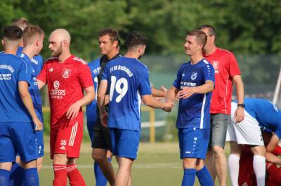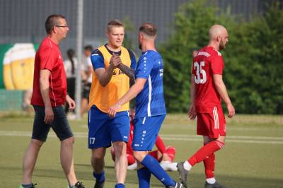 (FS/18.06.2022) Was für eine Leistung!!! Bei hochsommerlichen Temperaturen von 35°C absolvierten die Akteure auf dem Biedenkopfer Kunstrasenplatz in einem intensiven Pokalendspiel eine Leistung, die allen Akteuren allerhöchsten Respekt abverlangt. Der frischgebackenen Verbandsligaaufsteiger VfL Biedenkopf wollte seine Aufstiegseuphorie mit in die Partie nehmen und mit dem Heimvorteil im Rücken unserem FV 09 zeigen, wo der Henkelpott verbleiben sollte. Breidenbach musste zudem kurzfristig noch auf Spielertrainer Johannes Burk verzichten, der mit einer starken Magen- und Darmgrippe zuhause im Bett bleiben musste. Er wird über die sozialen Medien vom aktiven Geschehen auf dem Feld Bescheid bekommen haben, dass der VfL zu Beginn der Partie etwas aktiver nach vorne agierte und sich so ein leichtes optisches Übergewicht erspielte. Strafraumszenen sollten aber Mangelware bleiben, was an der beiderseitig guten Defensivarbeit der hinteren Reihen lag. Als Johannes Burks Trainerpartner Felix Baum nach einer guten Viertelstunde mit einem Zuckerpass über 40 Meter an der Strafraumgrenze freigespielt wurde, hatte er plötzlich nur noch VfL-Keeper Dominic Geiss vor sich. Der blieb völlig cool auf den Beinen und schnappte sich das Leder von Baums Füßen. Auf der Gegenseite spielte dem VfL mit seiner ersten richtigen Strafraumaktion die unglückliche Abwehraktion in der FV-Hintermannschaft in die Karten. Nicolai Herrmann startete in Minute 34 von rechts nach innen und nutzte die kurze Unachtsamkeit in der FV-Abwehr eiskalt aus. Sein Tor zum 1:0 war für FV-Keeper Tobias Ochs nicht zu halten. Breidenbach zeigte sich unbeeindruckt und spielte sein Konzept konsequent weiter. Mit etwas mehr Zug im Offensivspiel konnte der FV 09 die Partie fortan ausgeglichen gestalten. Mit einigen Halbchancen fehlte jedoch noch der finale und erfolgreiche Torabschluss.