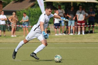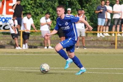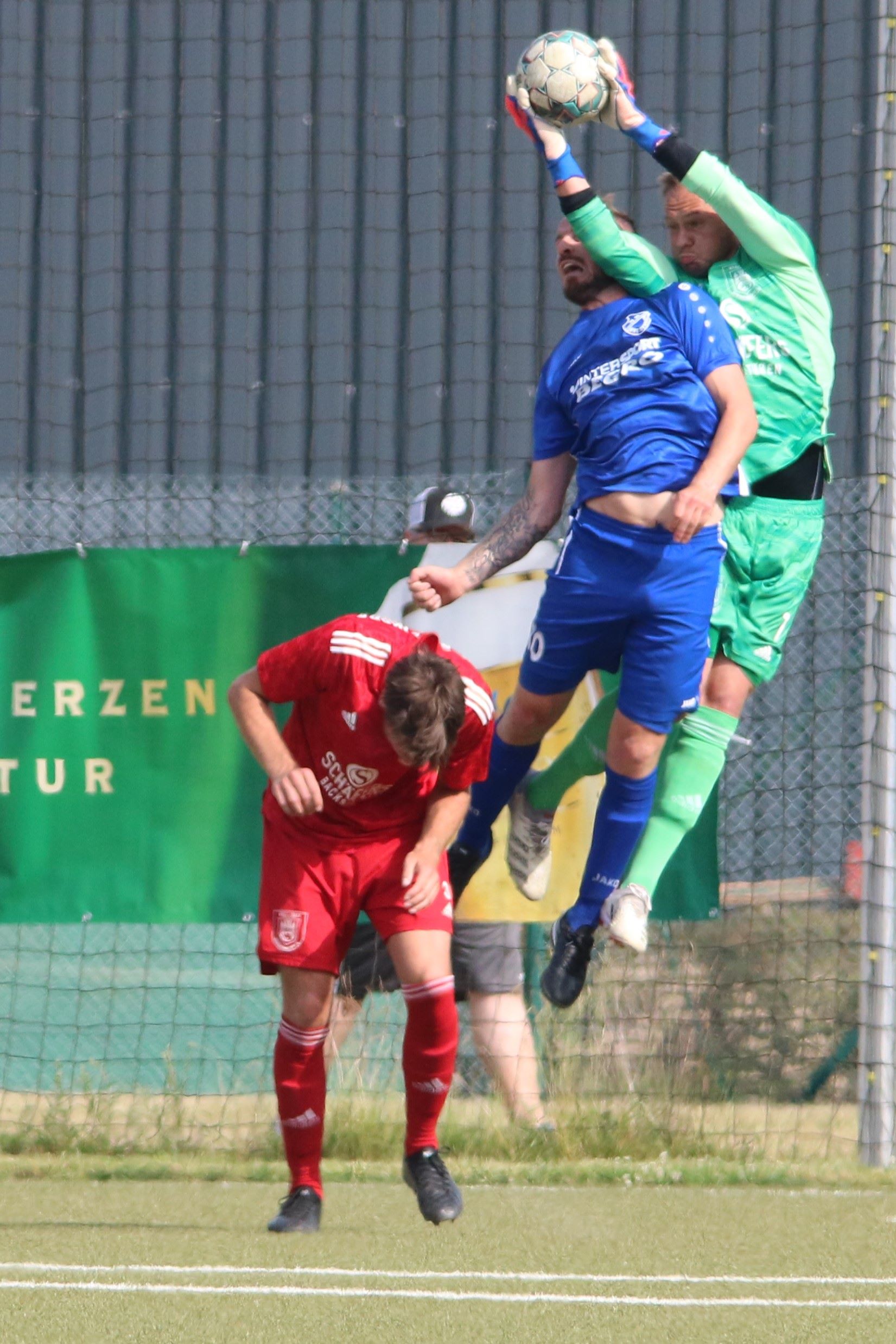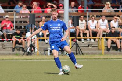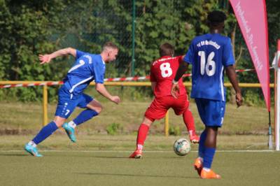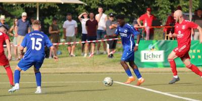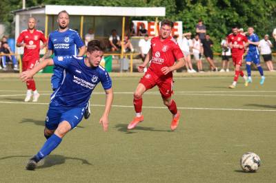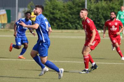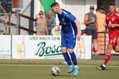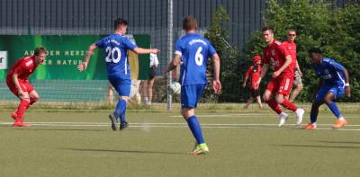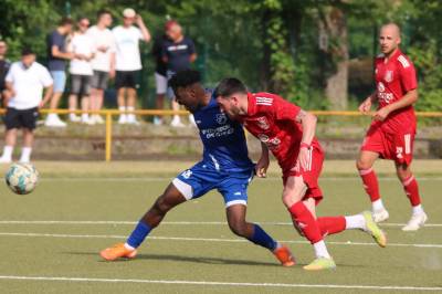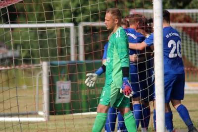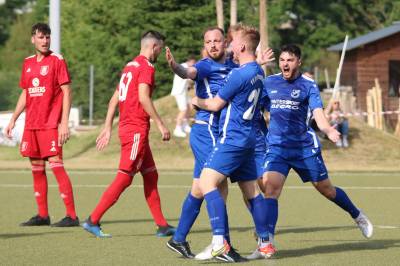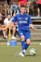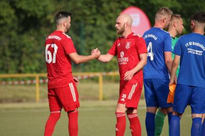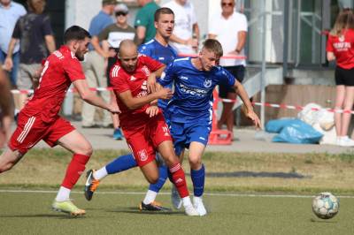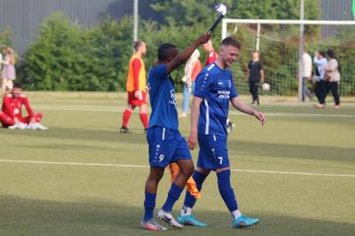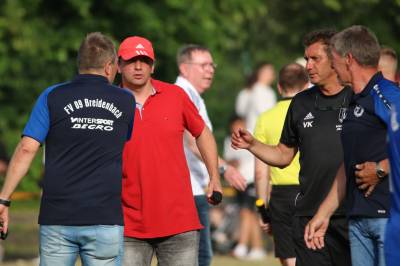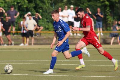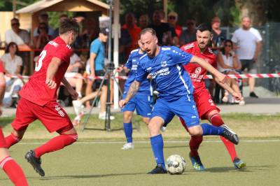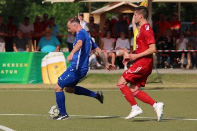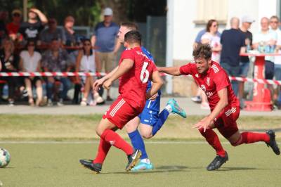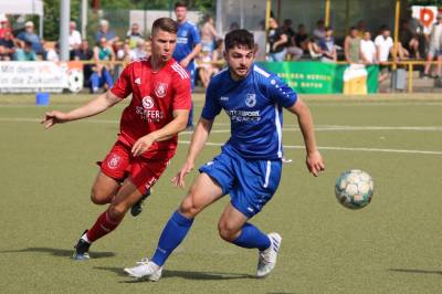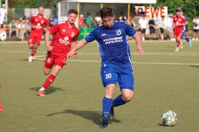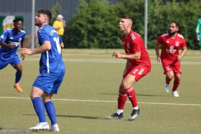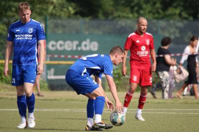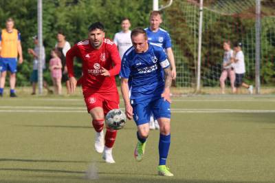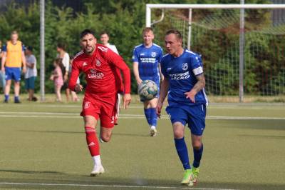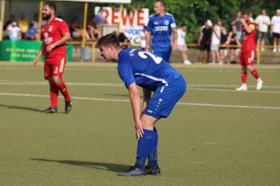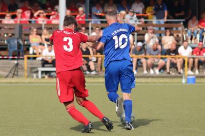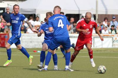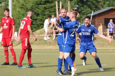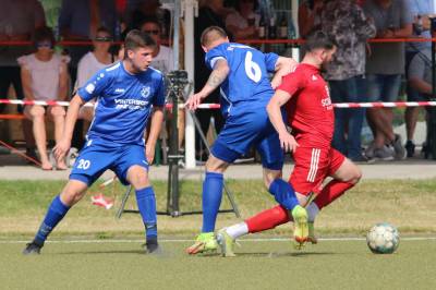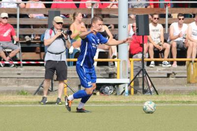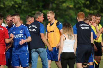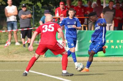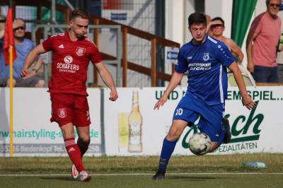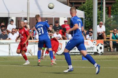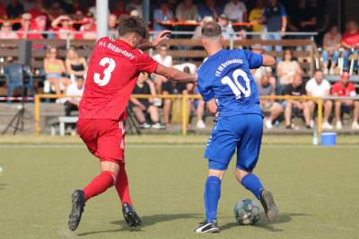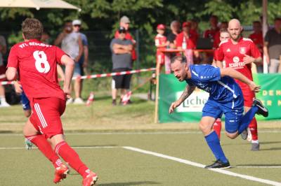 Das sollte sich in Halbzeit 2 dann ändern. Der Uhrzeiger hatte noch keine ganze Minutenumdrehung hinter sich gebracht, als Felix Baum im letzten Moment gestoppt wurde. Doch schon 30 Sekunden später sollte Breidenbachs Topspieler zeigen, warum er seit 10 Jahren das Maß aller Dinge im heimischen Fußball ist. Als der Ball den Weg in den Strafraum fand und die Kugel im hohem Bogen auf dem am zweiten Pfosten platzierten FV-Sturmführer flog, setzte dieser per Fallrückzieher mit einer Klasseaktion das Highlight des Spiels. Baum Abschluss war für Biedenkopfs Keeper Geiss unerreichbar und so stand es 1:1 in der 46. Minute. Jetzt war Breidenbach richtig im Spiel und dominierte gegen eine VfL-Elf, die sich doch beeindruckt zeigte. Als Aaron Künkel in der 55. Minute zum Solo ansetzte und sich mit einer Klasseaktion gegen mehrere VfL-Akteure durchsetzte, stand er plötzlich im Strafraum alleine vor Dominic Geiss. Eiskalt zeigte er sich im Abschluss und vollstreckte zum 1:2. Biedenkopf reagierte und Trainer Vladi Kovacevic wechselte Lukas Cegledi ins Mittelfeld ein. Das der bekanntlich im Kopfballspiel zu den guten gehört, sollte er bereits 5 Minuten später zeigen, als er als Abnehmer eines weiten Freistoßballs am langen Pfosten das Leder zum 2:2 einnickte. Jetzt war die Partie wieder völlig offen und beide Teams versuchten bei den hohen Temperaturen nochmal alles, um mit dem lucky Punch die Partie für sich zu entscheiden. Breidenbach erspielte sich dabei in Durchgang 2 einige Vorteile, agierte mit den ganz starken Alex Mamro und Dilan Vuantu im Mittelfeld, die mit FV-Kapitän Lukas Müller einen super Fixpunkt in der Zentrale hatten. Seine bravouröse Leistung krönte Breidenbachs Nils Cakar dann in der 70. Minute, als er nach einem seiner vielen gewonnenen Zweikämpfe mit einer ganz starken Einzelaktion über die rechte Angriffsseite durchmarschierte und im Stile eines Klassestürmers den spielentscheidenden Treffer zum 2:3 erzielte. Biedenkopf versuchte zwar am Ende nochmals alles, musste aber auch der laufintensiven Anfangsphase ein wenig Tribut zollen. Unser Team verteidigte klasse und verdiente sich den Sieg am Ende.