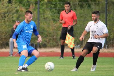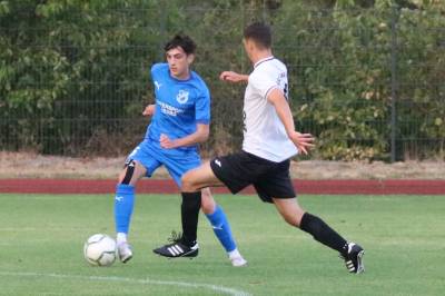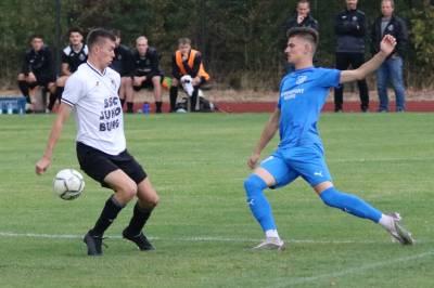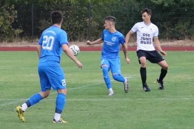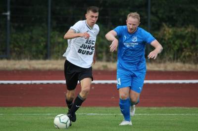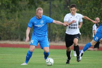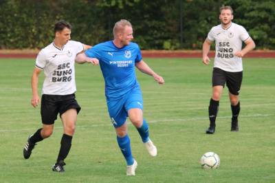 (FS/08.09.2022) Die Partie im Herborner Rehbergstadion sollte aufregende 94 Minuten liefern, die am Ende zur Freude unserer Elf mit einem 2:0-Auswärtssieg belohnt wurde. Die Gastgeber vom SSC Juno Burg versuchten von Beginn an die Kontrolle über Ball und Gegner zu bekommen. Gefährlich wurde es dabei immer wieder, wenn sie über die Außenpositionen das Spiel beschleunigten und dann mit scharfen Hereingaben im Strafraumzentrum versuchten zum Abschluss zu kommen. Den Torschrei auf den Lippen hatten die Burger bereits in Minute 6, als der Torabschluss von Mittelstürmer Nicolai Göbel schon Richtung Torlinie trudelte und FV-Keeper Tobias Ochs im letzten Moment mit einer Glanztat das Leder noch vor der Linie rettete. Und eben dieser Tobias Ochs sollte seine Ausnahmeform der letzten Wochen auch heute mehrfach eindrucksvoll unter Beweis stellen. Mit einer Bärenruhe und souveränen Aktionen steuerte er seine Vorderleute und hielt das, was auf seine Kasten kam in sicherer Manier. Und in Breidenbachs Defensivreihe sollten zunächst auf den Außenbahnen die Vorteile auf Burger Seite liegen. Mehrfach schafften es die Gastgeber, durch schnelle Angriffe Breidenbachs Abwehrrecken in Verlegenheit zu bringen. Alles in allem waren in den entscheidenden Momenten die Blau-Weißen aber zur Stelle und sicherten so bis zur Pause die Null auf der eigenen Abwehrseite. Und als dann Felix Baum in der 45. Minute über die halblinke Angriffsseite seinen Gegenspieler vernaschte und das Leder im langen Toreck versenkte, war auch Burgs Torhüter Alexander Bülow machtlos und der Matchplan des FV 09 zu 100 % umgesetzt.