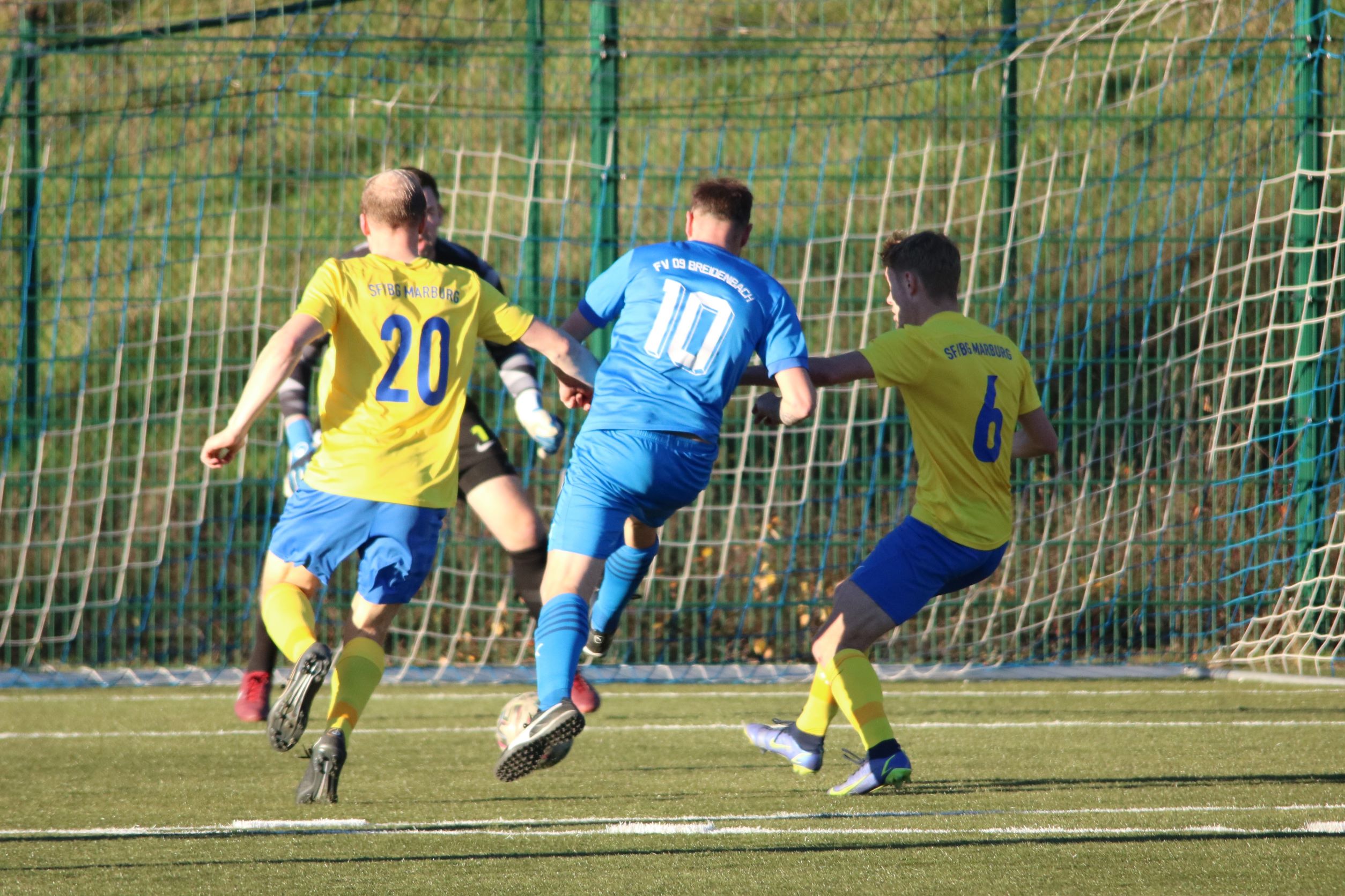 Nach der Pause zeigten sich die Gäste dann hoch engagiert. Breidenbach hielt dagegen und erspielte sich im Konterspiel zunächst ein leichtes Chancenplus. Felix Baum hatte mehrfach mit guten Einschussmöglichkeiten die Chance, sein Team auf die Siegerstraße zu bringen, scheiterte aber an zu ungenauen Abschlüssen oder an Marburgs Keeper Florian Eidam. Marburg zeigte jedoch ebenfalls seine Klasse im Offensivspiel und hatte ebenso mehrfach die Gelegenheit, den Ausgleich zu erzielen. Dies schafften die Gäste dann in der 58. Minute, als der eingewechselte Clemens Landau einen Steilpass als erster aufnehmen konnte und das Leder über Tobias Ochs im FV-Kasten ins Netz lupfte. Breidenbach spielte mit einer insgesamt guten Mannschaftsleistung bis zum Schlusspfiff, wenngleich Halbzeit 2 nicht ganz an die laufintensive erste Hälfte anknüpfen konnte. Die Sportfreunde Blau-Gelb Marburg präsentierten sich als starke Verbandsligaelf, die auch heute ihre bekannten Qualitäten wieder eindrucksvoll zeigen konnte und so nach einem intensiven Verbandsligaspiel einen verdienten Punkt mit nach Hause nehmen konnte. Für unsere Elf bleibt nach dem 3:3 in der vergangenen Woche beim VfL Biedenkopf auch heute am Ende nur ein 3:3 übrig, was uns in der Tabelle nur bedingt weiterhilft. Nach den gespielten 90 Minuten hat sich unsere Mannschaft dennoch für eine insgesamt gute Leistung ein Mannschaftslob verdient.