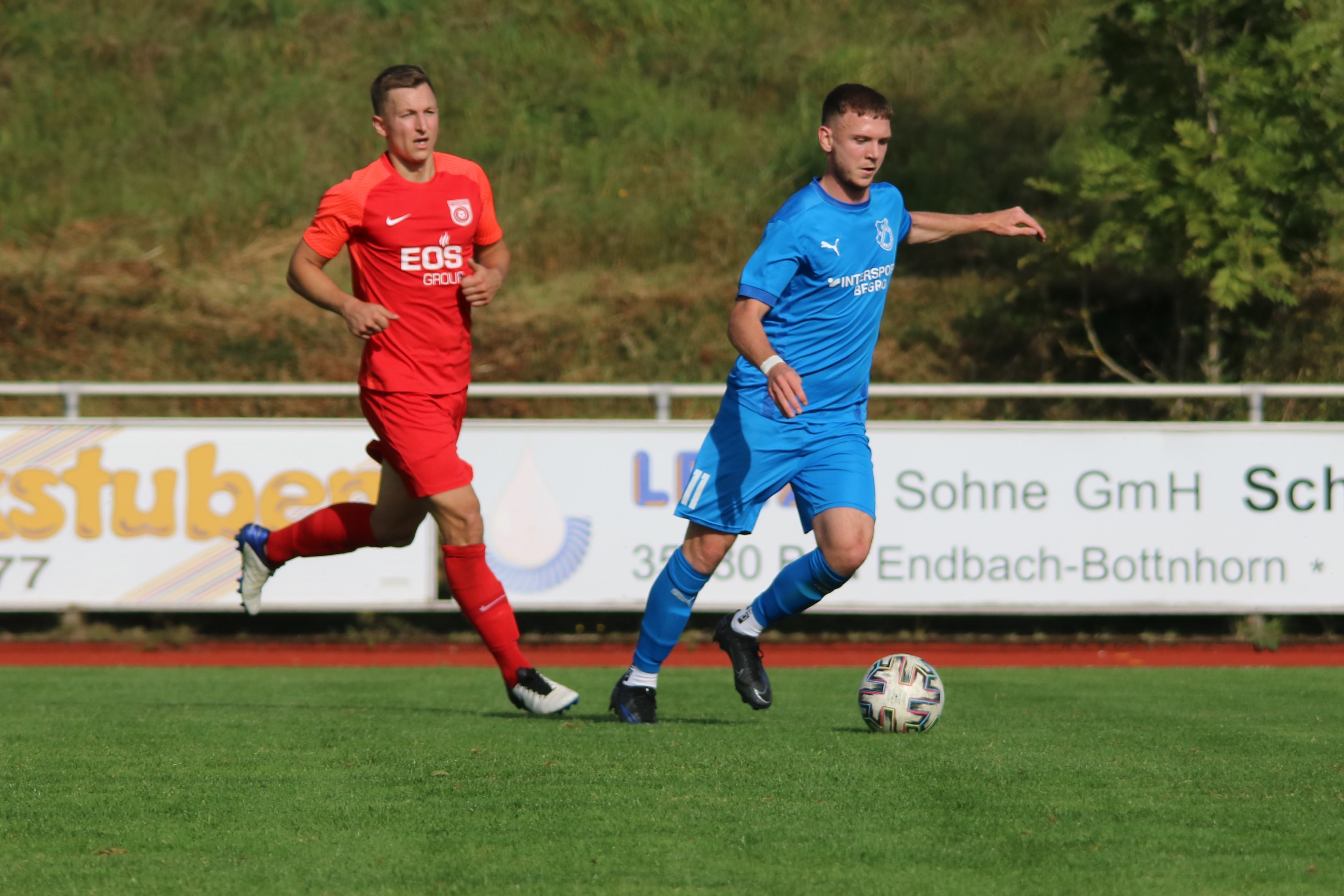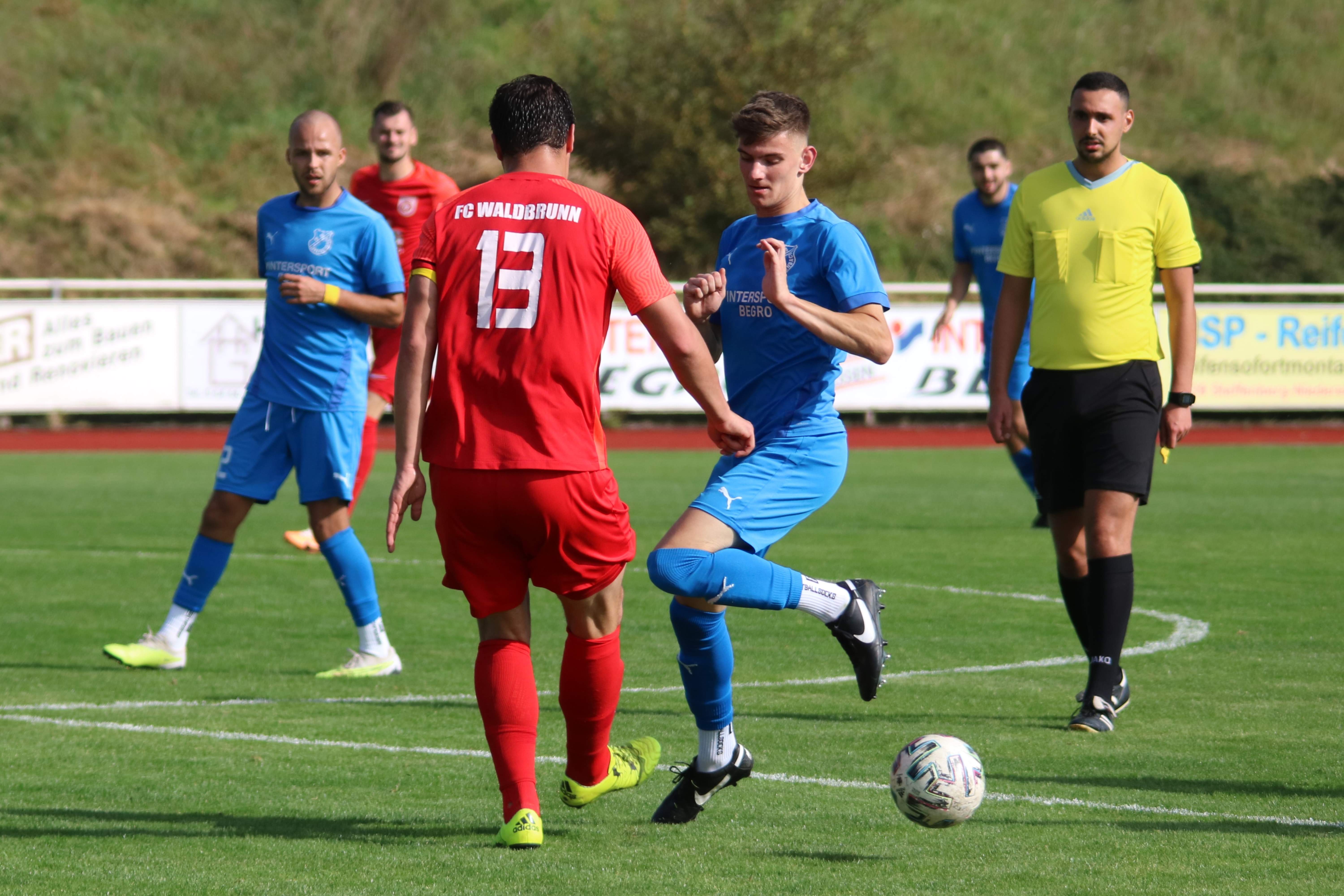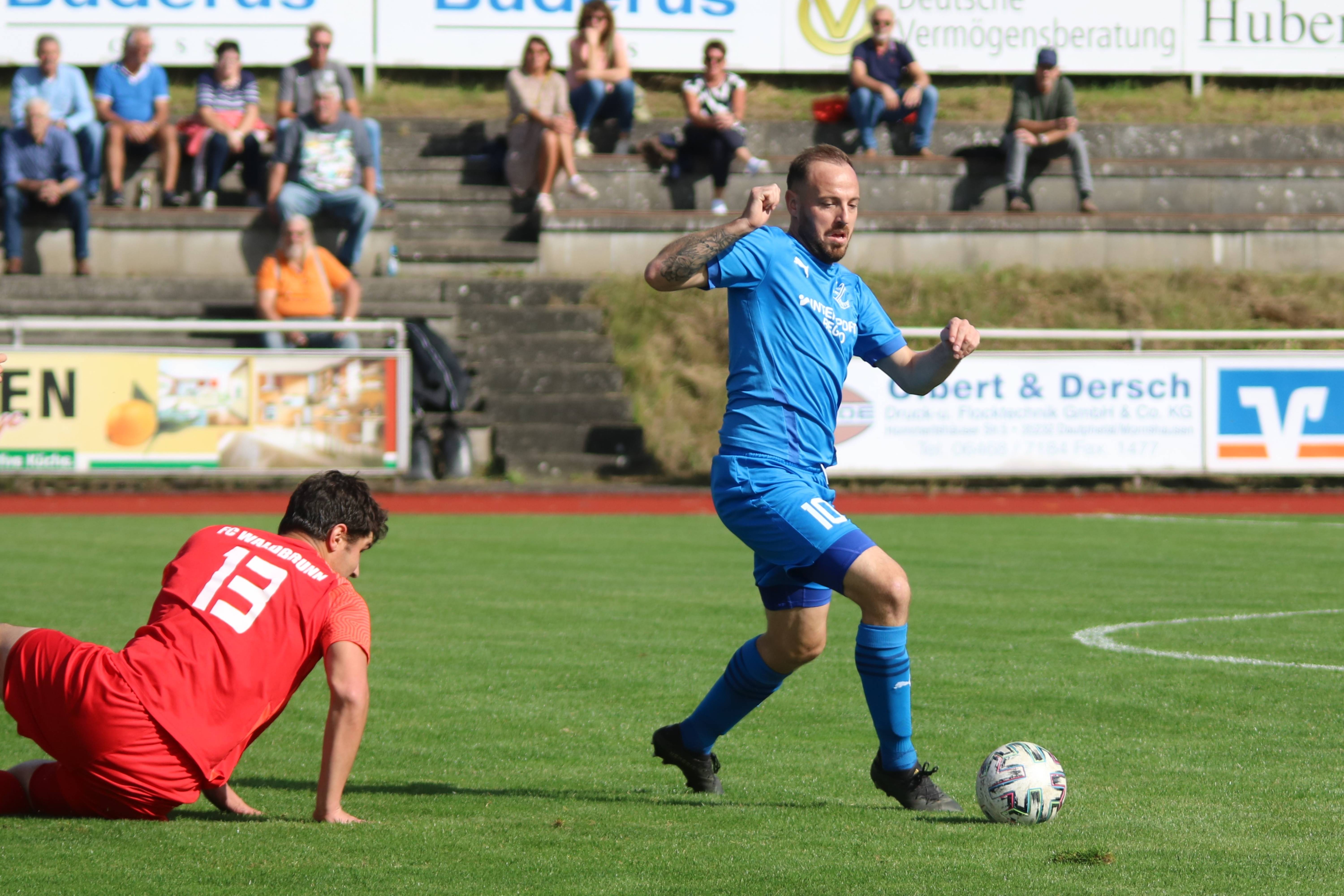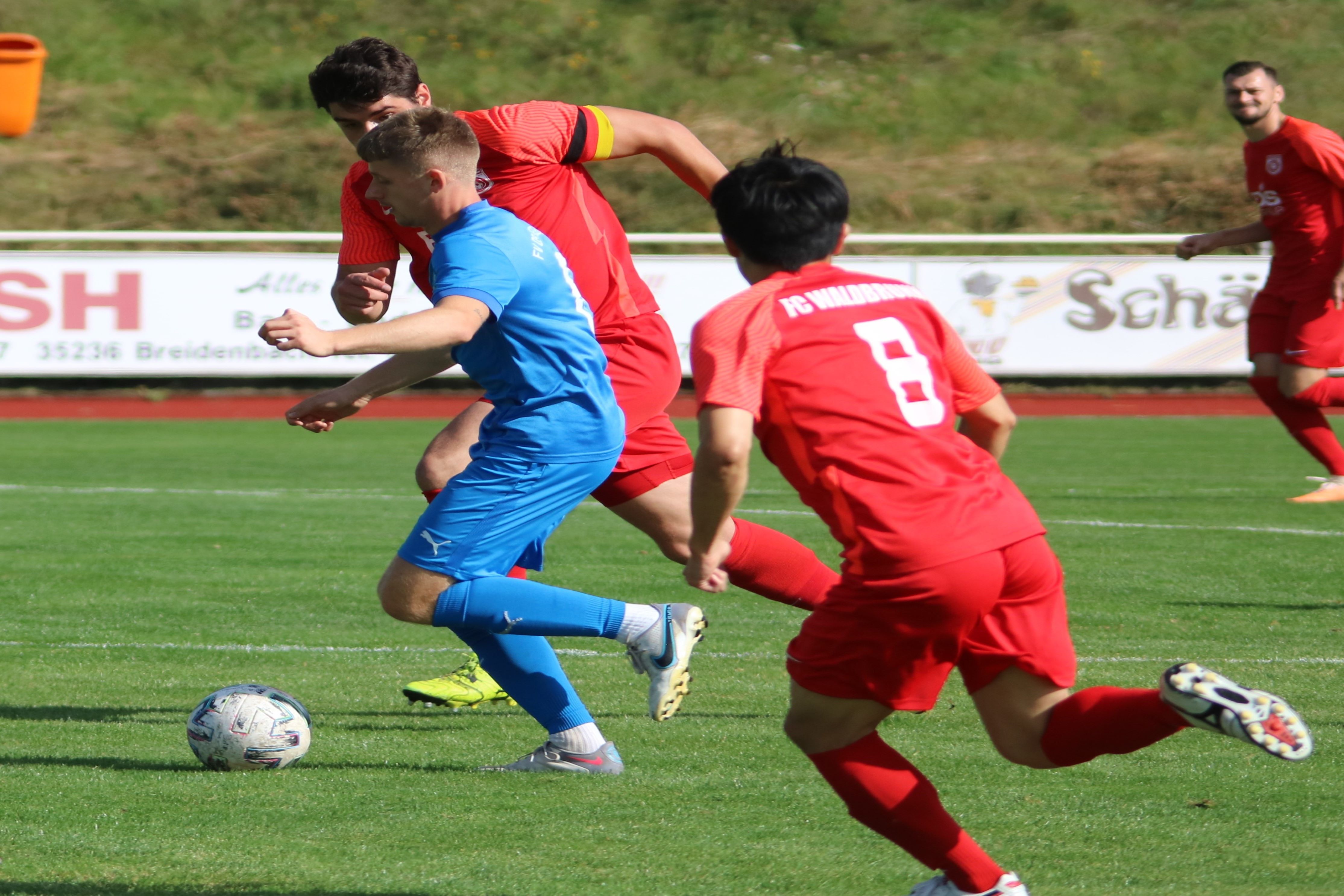 (30.09.2023/FS) Am Ende des Tages wird unsere Mannschaft nach einem intensiven Heimspiel und dem 1:1 Unentschieden gegen den FC Waldbrunn gut mit diesem Ergebnis leben können. Die Gäste aus Waldbrunn zeigten sich von Beginn an griffig auf dem Platz und erspielten sich optisch eine erkennbare Feldüberlegenheit. Der Unmut und die Unzufriedenheit einiger heimischer Edelfans war nicht zu überhören und der Wunsch nach mehr Offensive, mehr Mut nach vorne und weniger leichter Fehler beinhaltete alles, was über weite Strecken der Partie bei unserem FV 09 nicht so richtig funktionieren sollte. Das unsere Elf jedoch immer mit einer guten Einstellung und großem Engagement auf dem Platz agiert, spricht für sie und sollte schlussendlich auch zu recht mit dem späten Ausgleichstreffer durch Sebastian Wanke in der 82. Minute belohnt werden. Selbiger Spieler hätte bereits in der 11. Minute mit seinem Torabschluss die FV-Führung erzielen können, als er über die linke Angriffsseite nach einem gewonnen Zweikampf im Mittelfeld auf die Reise geschickt wurde. Gästekeeper Daniel Erbse reagierte jedoch prächtig und lenke das Leder nach dem Linksschuss auf das lange Toreck gerade noch am Pfosten vorbei. Vor den Toren passierte verhältnismäßig wenig, was der guten Abwehrarbeit beider Hintermannschaften geschuldet war. Die optische Überlegenheit der Gäste sollte sich dann in der 37. Minute auszahlen, als zunächst auf Breidenbacher Seite mit einem leichten Ballverlust FC-Kapitän Lukas Scholl das Leder in die Füße gespielt wurde und der sich dann artig bedankte und das Leder aus 20 Metern unhaltbar unten links ins Netz beförderte. Damit ging es in die Pause und die Gäste hatten sich die Führung insgesamt verdient, weil sie aktiver und mit weniger Fehlern auf dem Feld agiert hatten.