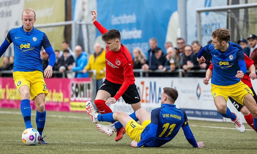 Die Partie im Marburger Zwetschenweg sollte der Klasse und Spannung aus der Hinrundenpartie beim 3:3 Unentschieden nach zwischenzeitlicher 3:0-Führung des FV 09 um nichts nachstehen. Gerade mal 6 Minuten waren gespielt, als Felix Baum seinen Sturmpartner Aaron Künkel bediente. Der hatte den Blick für den wieder ganz starken Emil Hallermann, welcher wiederum mit seinem Treffer zum 1:0 seine derzeitige Topform bestätigte. Blau-Gelb reagierte umgehend und erspielte sich bereits 2 Minuten später die Chance zum Ausgleich. Kapitän Clemens Haberzettl platzierte seine Flanke punktgenau auf Clemens Landau, der mit seinem Treffer zum 1:1 den Ausgleich erzielte. Beide Abwehrreihen agierten in der Folgezeit aus einer starken Defensive, sodass keine nennenswerte Torchancen zu verzeichnen waren. Es dauerte bis zur 44. Minute, als Felix Baum mit seiner Torchance Marburgs Keeper Florian Eidam zu einer Glanztat zwang. Und noch vor dem Pausenpfiff konnte der FV 09 die nächste Torgelegenheit verzeichnen. Nils Cakar, der kurz zuvor für den angeschlagenen Moritz Filipzik aufs Feld geschickt worden war, nutzte eine Unaufmerksamkeit in Marburgs Abwehr und setzte seinen Linksschuss in der 45. Minute ins Netz der Gastgeber. Mit 1:2 ging es in die Pause und der FV 09 hatte sich eine gute Ausgangslage für die 2. Halbzeit geschaffen.