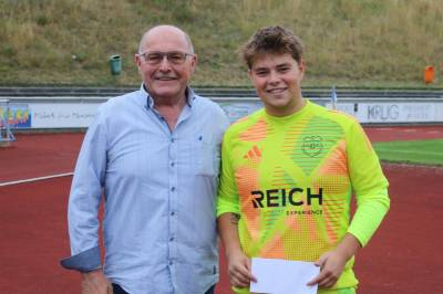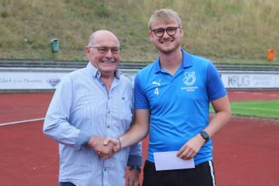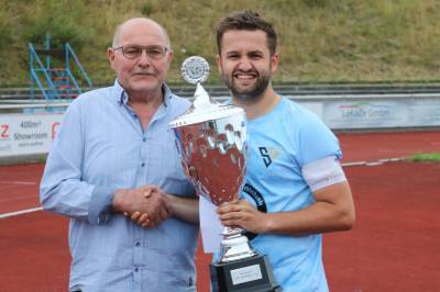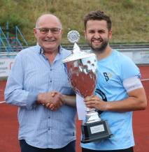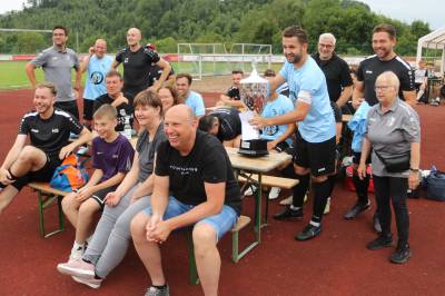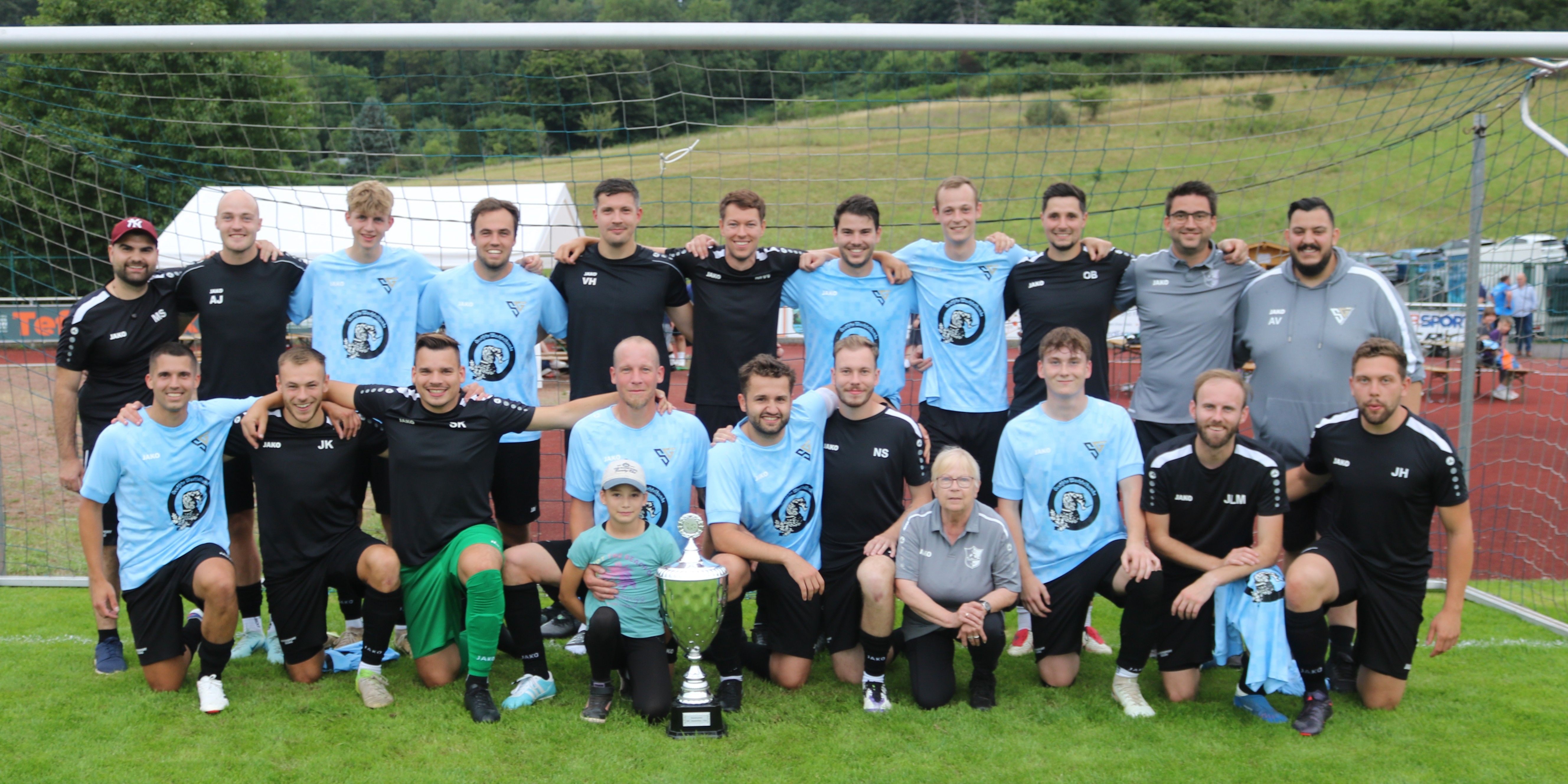 (FS/21.07.2025) In einem kurzweiligen Jubiläumsturnier im Breidenbacher Gunterstal war es der Frankenberger Kreisoberligist, der als Überraschungssieger das Preisgeld von 650 Euro und den Wanderpokal von Turniernamensgeber und Sponsor Horst Rein in Empfang nehmen konnte. Am Ende des Tages war der Sieg auch völlig verdient, weil das Siegerteam am effektivsten mit seinen Torchancen umging und so am Tagesende mit 4:1 Toren und 7 Punkten ungeschlagen den Pott sicherte. Turnierzweiter wurde die SG Eschenburg, die mit 4:2 Toren und 6 Punkten unsere Elf vom FV 09 Breidenbach mit 2:2 Toren und 4 Punkten hinter sich lassen konnte. Den vierten Platz belegte der FC Türk Gücü Breidenbach mit 0:5 Toren und 0 Punkten.